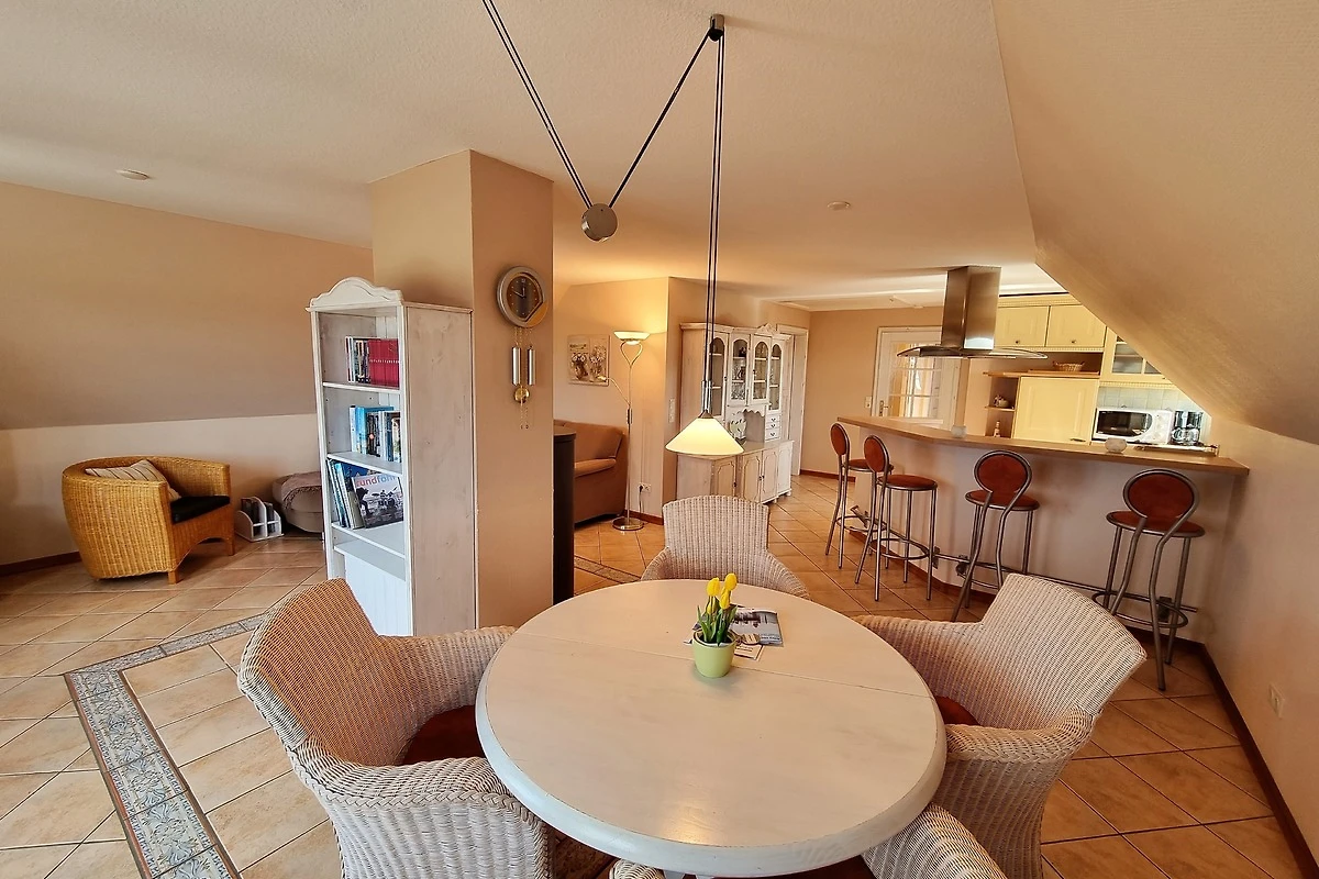 Die Wohnung verfügt über eine offene Landhausküche mit Theke, die sehr gut ausgestattet ist. Der grosszügige Wohn- und Essbereich mit Kamin lädt zu gemütlichen Stunden ein.