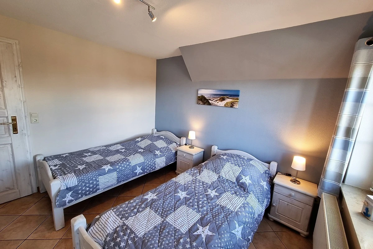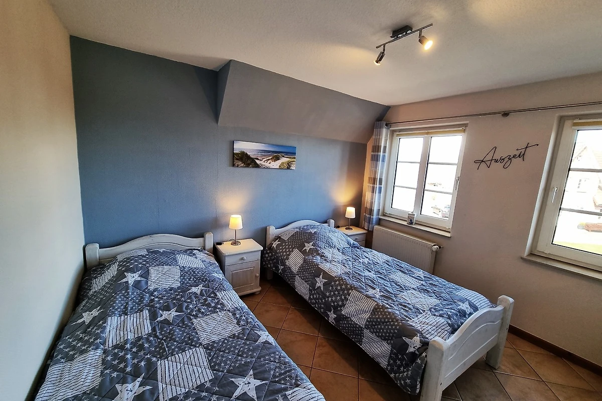 Das zweite Schlafzimmer verfügt über zwei Einzelbetten (je 0,90 × 2,00 m) sowie ebenfalls über einen Kleiderschrank.