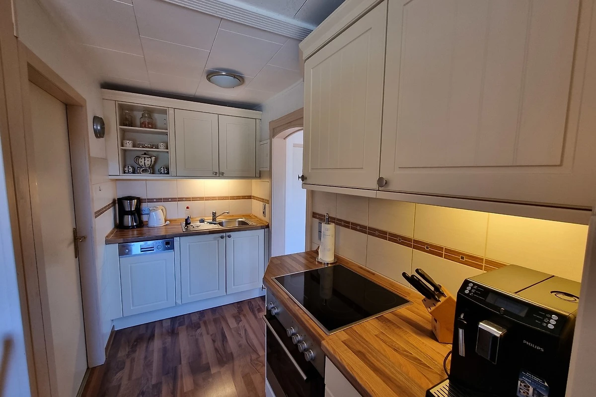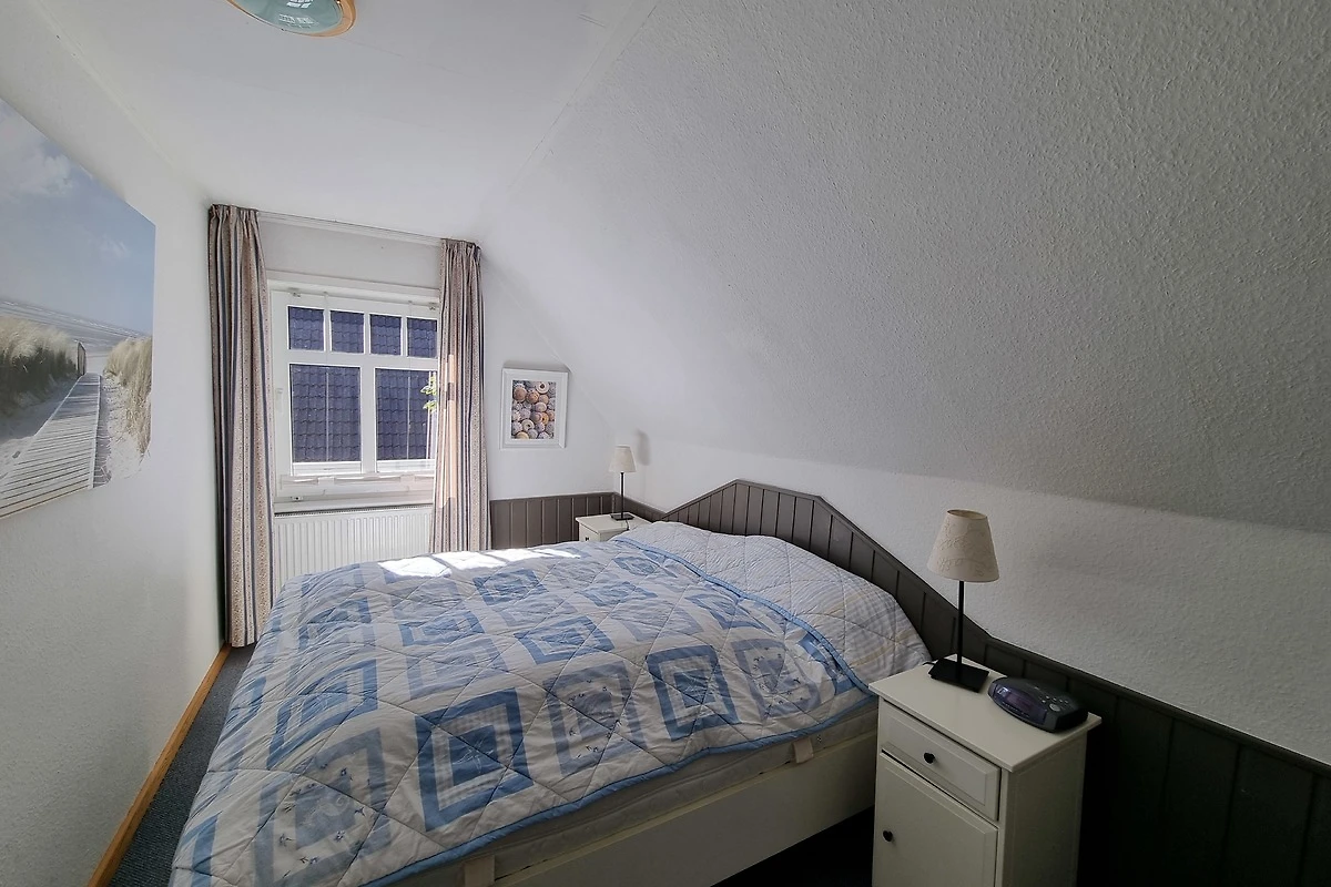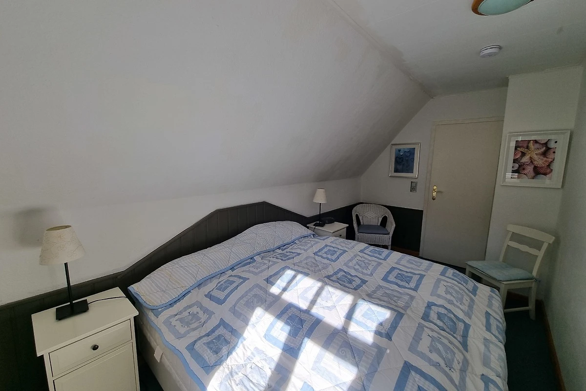 Die ca. 65 m² grosse OG-Wohnung rechts bietet für bis zu 4 Personen Platz. Von hellen, offenen Wohnbereich gelangt man zu einer offenen Küchenzeile mit sämtlichem Komfort und von dort geht es weiter in das offene Esszimmer. Über die Eingangsdiele gelangt man in das Elternschlafzimmer mit einem Doppelbett 1,80x2,00m. Die geschwungene Holztreppe führt in die offene Galerie. Hier befindet sich das Kinderzimmer mit französischem Bett 1,40x2,00 und eigenem Fernseher. Das Duschbad befindet sich auf der unteren Ebene.