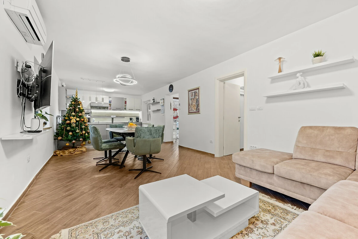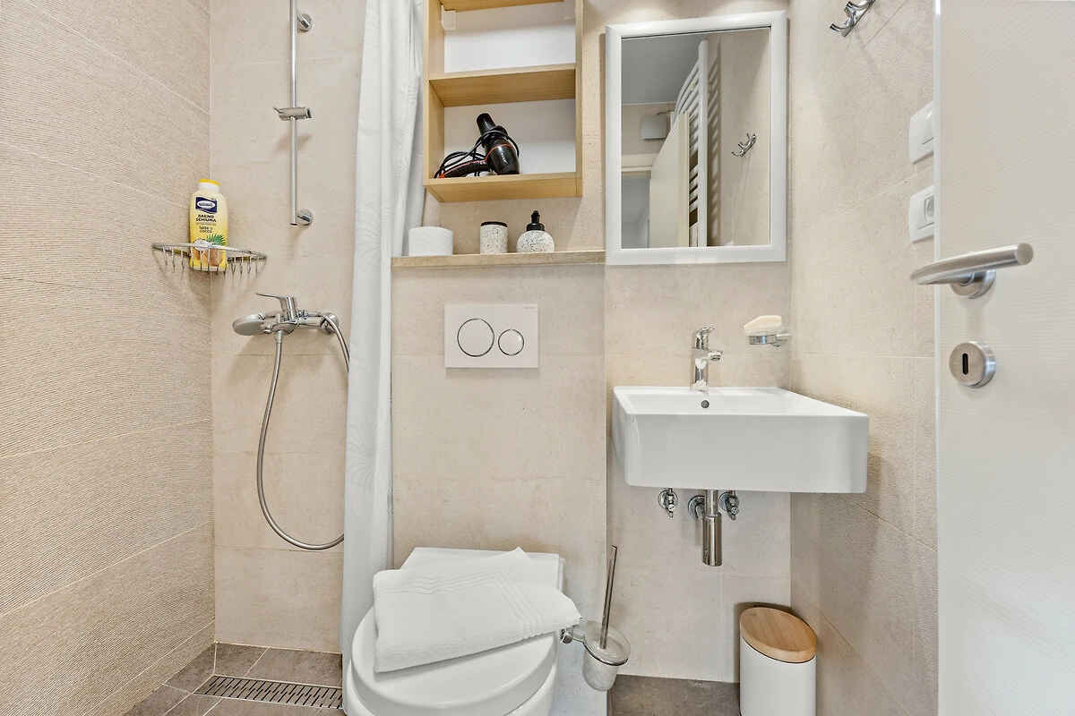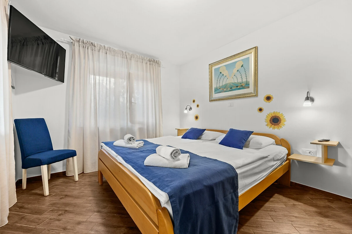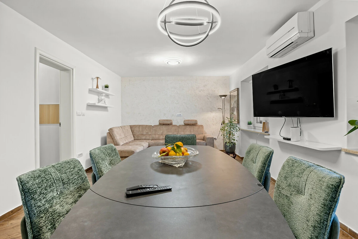 Diese Unterkunft ist am besten für Familien geeignet. Es ist ein Apartment mit drei Schlafzimmern, 2 Badezimmern (eines davon en suite), einer voll ausgestatteten Küche, einem geschmackvoll eingerichteten Wohnzimmer und einer geräumigen Terrasse (20 m2), auf der die Gäste die frische Luft und den Meerblick geniessen können. Das Apartment verfügt über 2 Klimaanlagen und 3 internetfähige Fernseher.