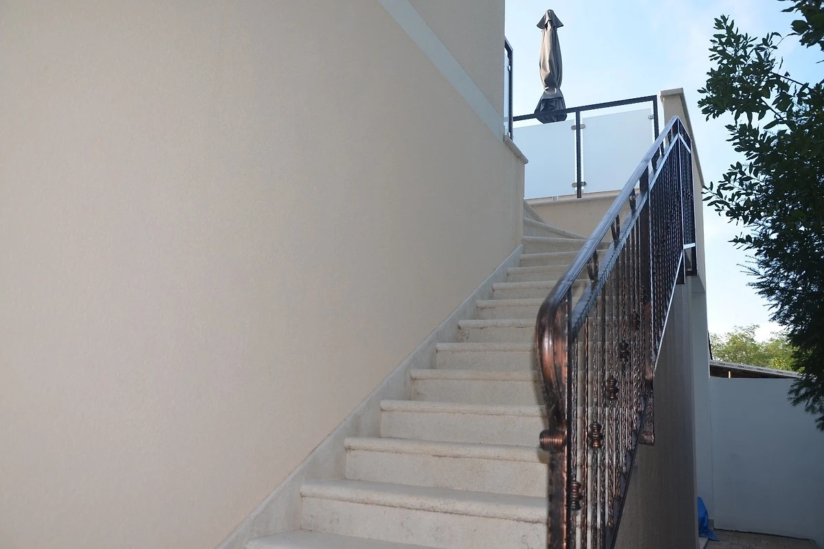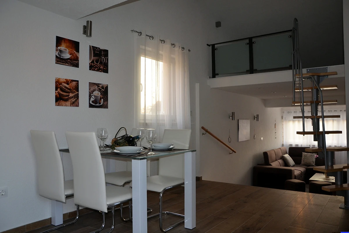 Die klimatisierte Nichtraucherwohnung ist neu eingerichtet, befindet sich mit ca. 60 qm im Obergeschoss der wundervollen Villa. Sie, besteht aus offenem Wohnzimmer mit offener über die Treppe zugänglicher Galerie, Flat-TV mit SAT-Anschluss, kostenlosem Internet (Free Wi-Fi) und komplett ausgestatteter Küche. Bad und WC mit Dusche, ein Schlafzimmer mit einem Doppelbett 160 x 200 cm und einer offene Terrasse.