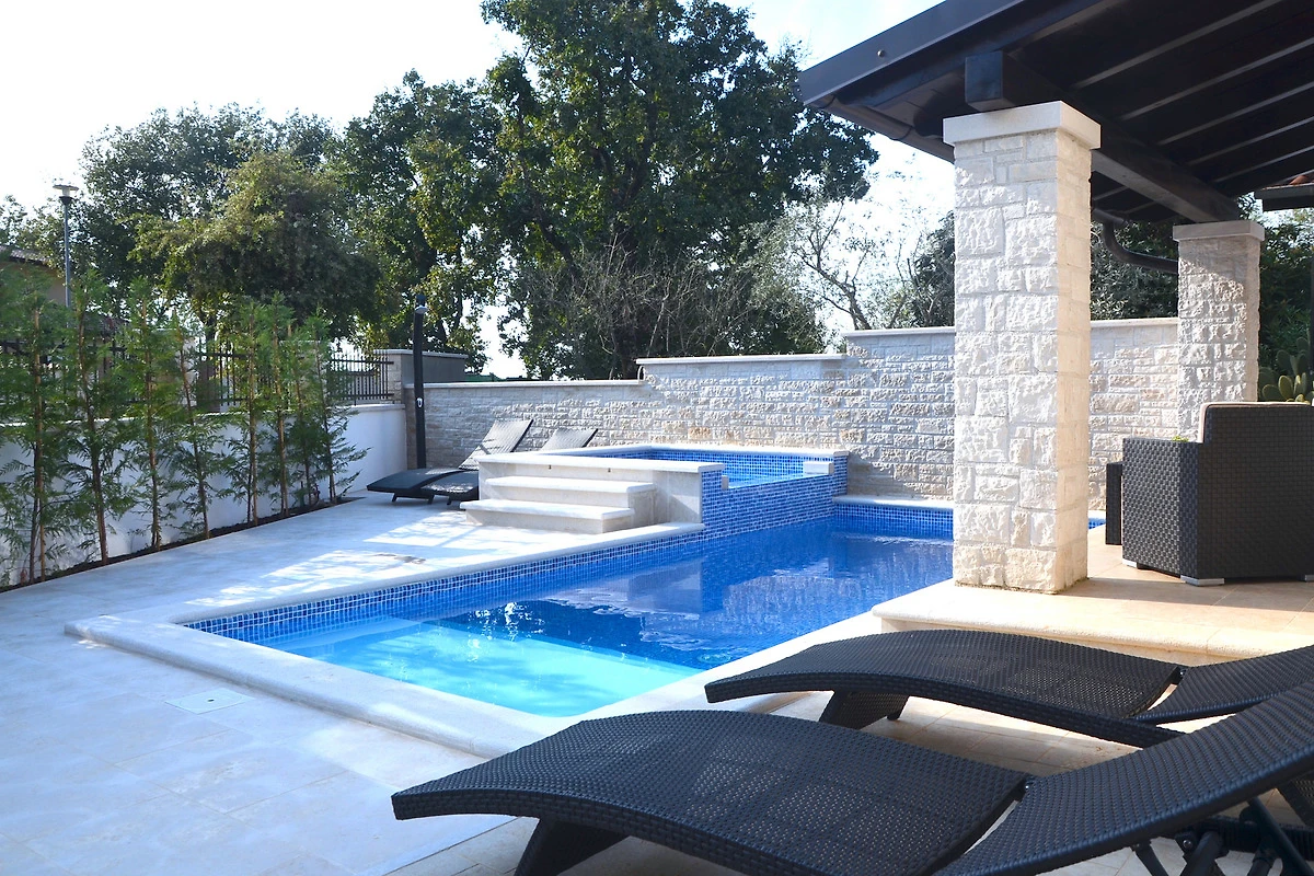Unsere Villa liegt auf einem sehr stimmigen 500 m2 grossen abgeschlossenen mit einer Natursteinmauer umgebenem Grundstück. Im Garten mit Grillplatz, Aussendusche, beheiztem Pool und Jacuzzi (Whirlpool), lässt es sich sehr angenehm durch die gegebene Atmosphäre geniessen. Kostenlose Parkplätze stehen auch zur Verfügung.