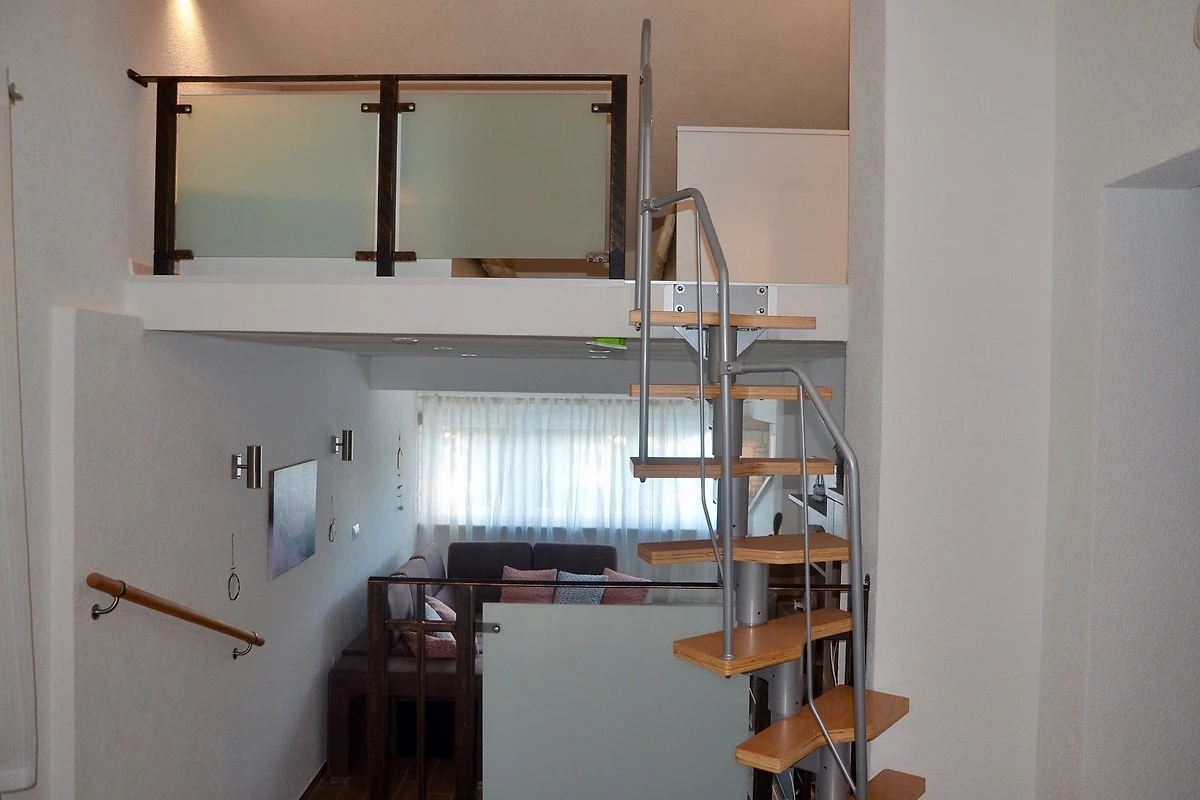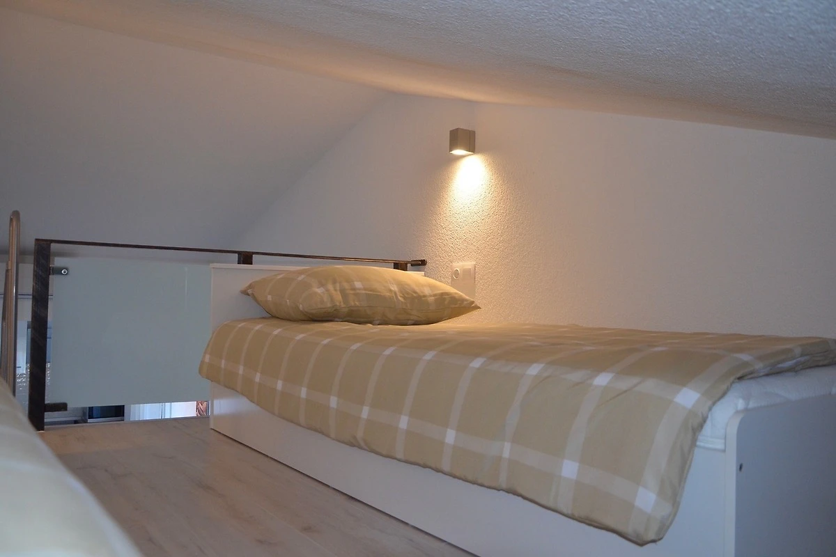 Schlafmöglichkeit für Kinder ist auf offene Galerie mit Dachschräge (ohne Verdunkelungsmöglichkeit) mit 2 x Einzelbetten.