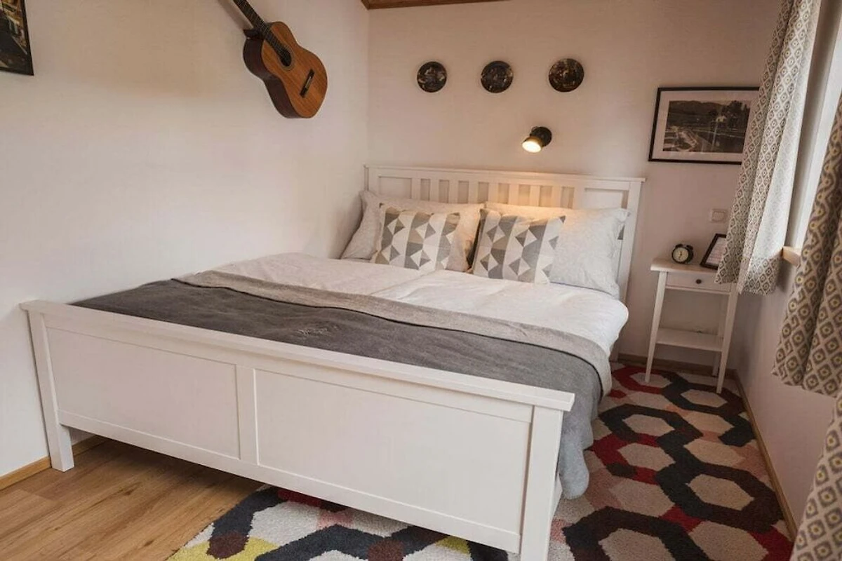 Das große Schlafzimmer ist mit einem hochwertigen Doppelbett, einer Schlafcouch, einem Kleiderschrank und Zugang zum Balkon (Nord-Ost) ausgestattet. Das kleinere Schlafzimmer verfügt über ein Doppelbett, einen Kleiderschrank und ebenfalls einen Zugang zum Balkon (Nord-Ost).