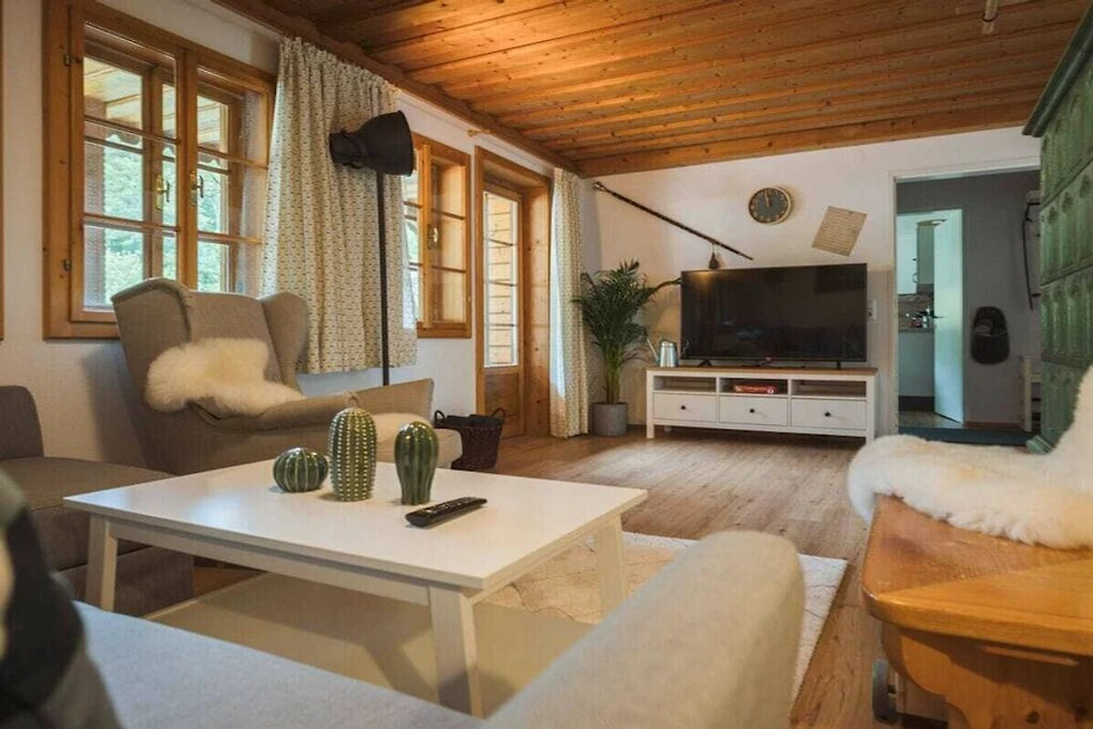 Der gemütliche Wohnbereich ist mit einer Sitzgruppe mit Schlafcouch, sowie moderner Entertainment-Ausstattung (55''Smart-TV, Bluetooth-Musikanlage) ausgestattet und lädt zum Verweilen ein.