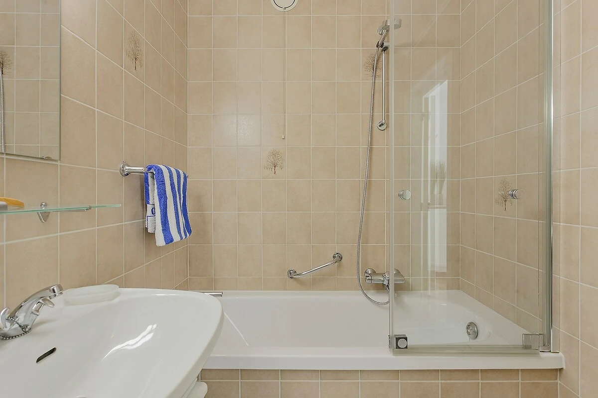 Die voll ausgestattete Küche umfasst einen Toaster, eine Saftpresse, einen Kühlschrank mit Gefrierfach, eine Kaffeemaschine, eine Mikrowelle, einen Backofen, einen Glaskeramikherd und einen Wasserkocher. Das Badezimmer verfügt über eine Dusche in der Badewanne, einen Handtuchtrockner, ein Doppelwaschbecken und einen Haartrockner. Eine separate Toilette sorgt für zusätzlichen Komfort, während ein Wäscheständer, ein Staubsauger, ein Bügeleisen und ein Bügelbrett die Ausstattung vervollständigen. WLAN ist verfügbar und die Nebenkosten sind im Preis inbegriffen.