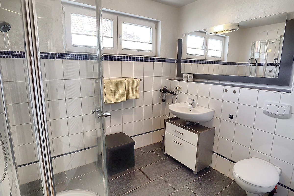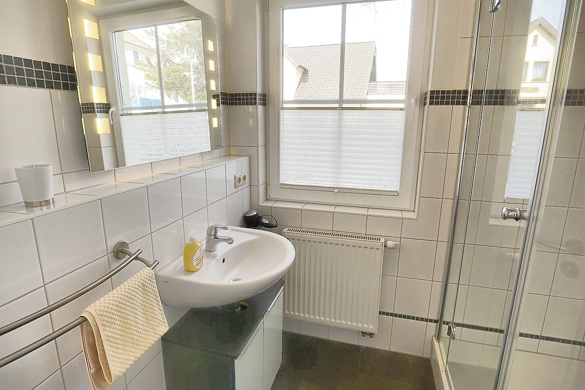Nun zur Unterkunft selbst: Es gibt zwei Autostellplätze, einen kleinen Fahrradschuppen und einen kleinen Garten mit Terrasse und eigenem Strandkorb. Das Haus ist erst wenige Jahre alt und die Wohnung ist sehr hochwertig ausgestattet: Zwei moderne Bäder jeweils mit Duschkabinen aus Echtglas. Fön und Handtücher waren ebenfalls vorhanden. Ein geräumiges Wohn-/Esszimmer mit modernen Massivholzmöbeln sowie eine kleine Küche und ein kleiner Abstellraum. Im OG sind die Schlafzimmer untergebracht.