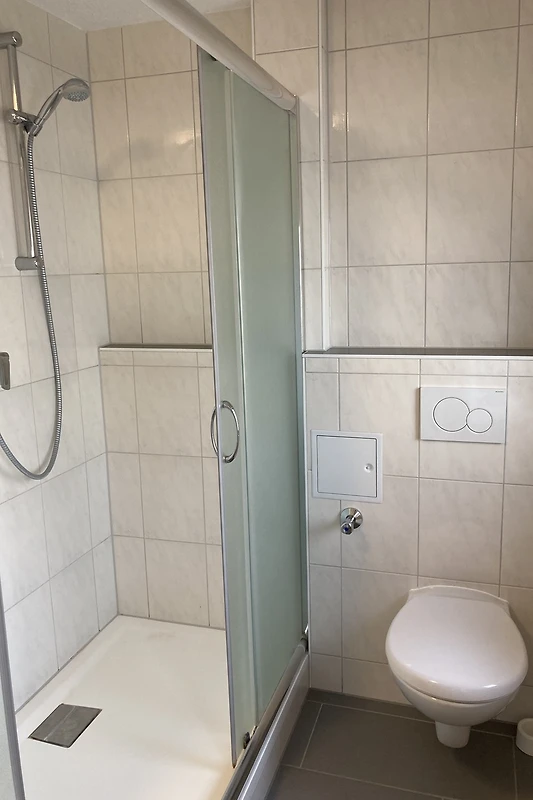 1 kleines Bad mit Dusche, WC und Waschbecken.