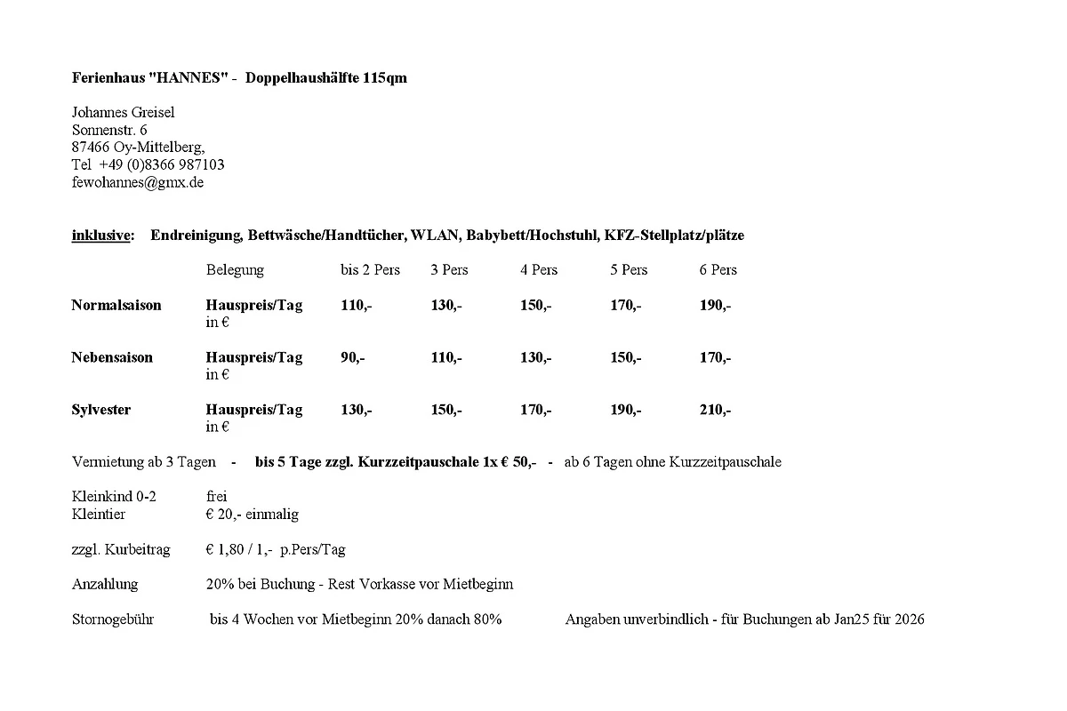 Inclusive: Endreinigg, Bettwäsche/Handtücher, WLAN+, Strom/Wasser/Heizung, Babybett/Hochstuhl, Stellplatz/-plätze, Gästekarte (öffentliche Verkehrsmittel gratis),