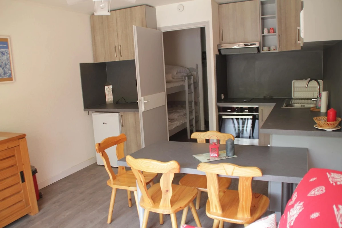 Das charmant gestaltete Anwesen bietet ein gemütliches und voll ausgestattetes Studio für bis zu vier Gäste. Das 24 m² große Studio verfügt über einen komfortablen Wohnbereich mit Doppelschlafsofa und Etagenbett und ist somit ideal für Familien oder kleine Gruppen. Zur Ausstattung gehören ein Flachbild-Kabel-TV und ein Balkon mit Gartenmöbeln, von dem aus Sie den Bergblick genießen können. Haustiere sind in der Unterkunft willkommen, Gäste können also gerne ihre Haustiere mitbringen. Das Anwesen bietet seinen Gästen außerdem einen Außenparkplatz. Ein Aufzug sorgt für bequeme Mobilität innerhalb des Gebäudes. In der Hochsaison steht ein kostenloser Shuttleservice zur Verfügung.