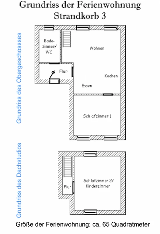 Das "Haus Strandkorb" bietet Ihnen natürlich WLAN im gesamten Haus an. Jede unserer Wohnungen ist mit einem Flachbildfernseher, einer hochwertigen Matratze und einer modernen Küche ausgestattet, die alle Elektrogeräte und einen Esstisch beinhaltet. Die Badezimmer sind ebenfalls hochwertig ausgestattet und bieten eine optimale Platzausnutzung. Einige unserer Wohnungen verfügen über eine eigene Terrasse, und eine Wohnung ist sogar mit einem Wintergarten ausgestattet. Zudem stehen unseren Gästen gemeinschaftlich genutzte Waschmaschinen und Wäschetrockner zur Verfügung. Hinter dem Haus erwartet Sie ein schöner Garten mit viel Platz für die Kinder. Ferienwohnung "Strandkorb 3" Grösse: ca. 65 Quadratmeter Wohnraum mit integrierter Küche Schlafzimmer zweites separates Schlafzimmer/Kinderzimmer Badezimmer mit Dusche, Waschtisch und WC Obergeschoss optimal für 2 bis 4 Personen und zusätzlich ein Kleinkind