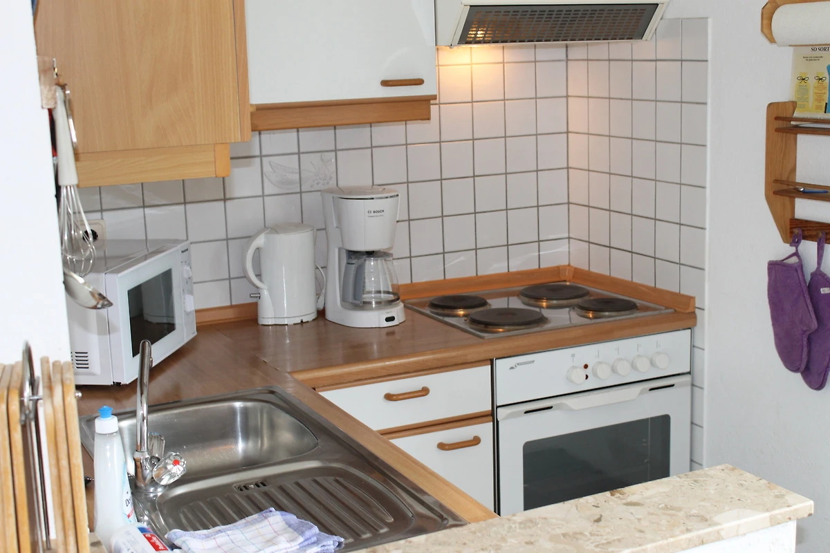 Die offene Küche ausgerüstet mit Backofen, Mikrowelle, Kaffeemaschine usw. hat direkten Zugang zu dem lichtdurchfluteten Essplatz, der in den Wohnbereich integriert ist. Zusätzlich sind für ein Kleinkind Hochstuhl und Kinderbett vorhanden.