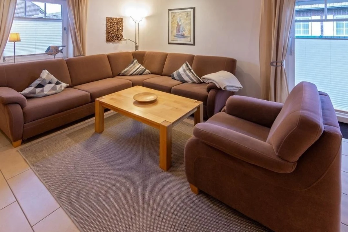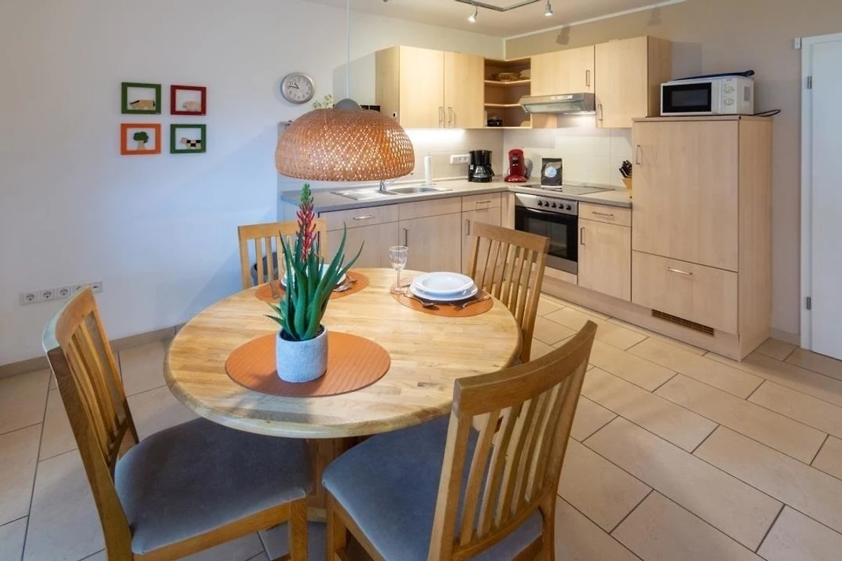Der Wohnbereich ist grosszügig gestaltet und umfasst eine bequeme Sitzgruppe mit hochwertiger Schlafcouch, einen Wohnzimmerschrank und einen 102 cm grossen Flachbildfernseher mit Satellitenempfänger und HDTV. Die integrierte Küchenzeile ist gut ausgestattet mit Ceranherd, Kühlschrank, Gefrierfach, Mikrowelle, Spülmaschine, Kaffeemaschine, Wasserkocher, Mixer, Toaster, Eierkocher und Elektrogrill. Ein Essbereich mit Esstisch und bequemen Stühlen ist ebenfalls vorhanden. Die Wohnung verfügt über eine Heizung und eine Sofaecke mit Sofa und Sesseln.