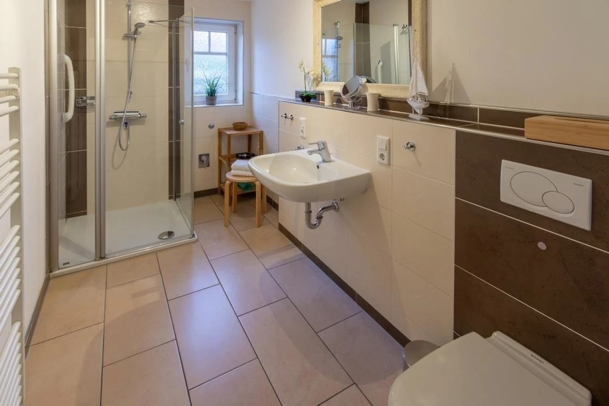 Die Terrasse mit Gartenmöbeln, Liegewiese, Sonnenliegen, Sonnenschirm und Windschutz lädt zum Entspannen ein. Weitere Annehmlichkeiten der Wohnung sind kostenloses WLAN, ein Privatparkplatz, eine Waschmaschine, ein Trockner, ein Bügeleisen, ein Bügelbrett, ein Wäscheständer, ein Safe, ein Ganzkörperspiegel, Feuermelder, ein Staubsauger, ein Verbandskasten, Fliegengitter und Reinigungsmittel. Eine eBike-Ladestation ist ebenfalls vorhanden.