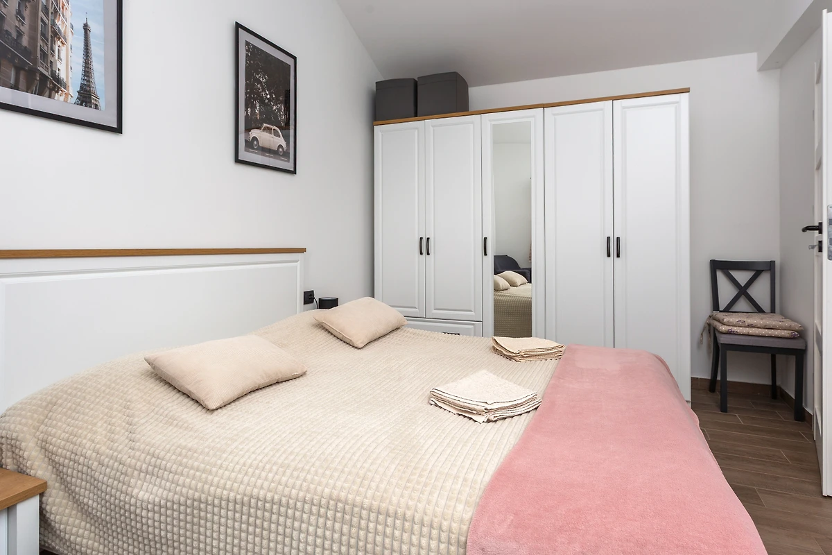 Auf der gleichen Etage befindet sich ein Doppelzimmer. Das Zimmer ist geräumig, hell und mit grossen Schränken zur Aufbewahrung von Kleidung ausgestattet. Es gibt auch einen Schreibtisch - für die Arbeit von zu Hause aus. Oder zum Schreiben. Wer weiss, wozu die schöne Natur rund um das Haus Sie noch inspirieren wird. Auf der gleichen Etage befindet sich auch ein Badezimmer mit Duschkabine.