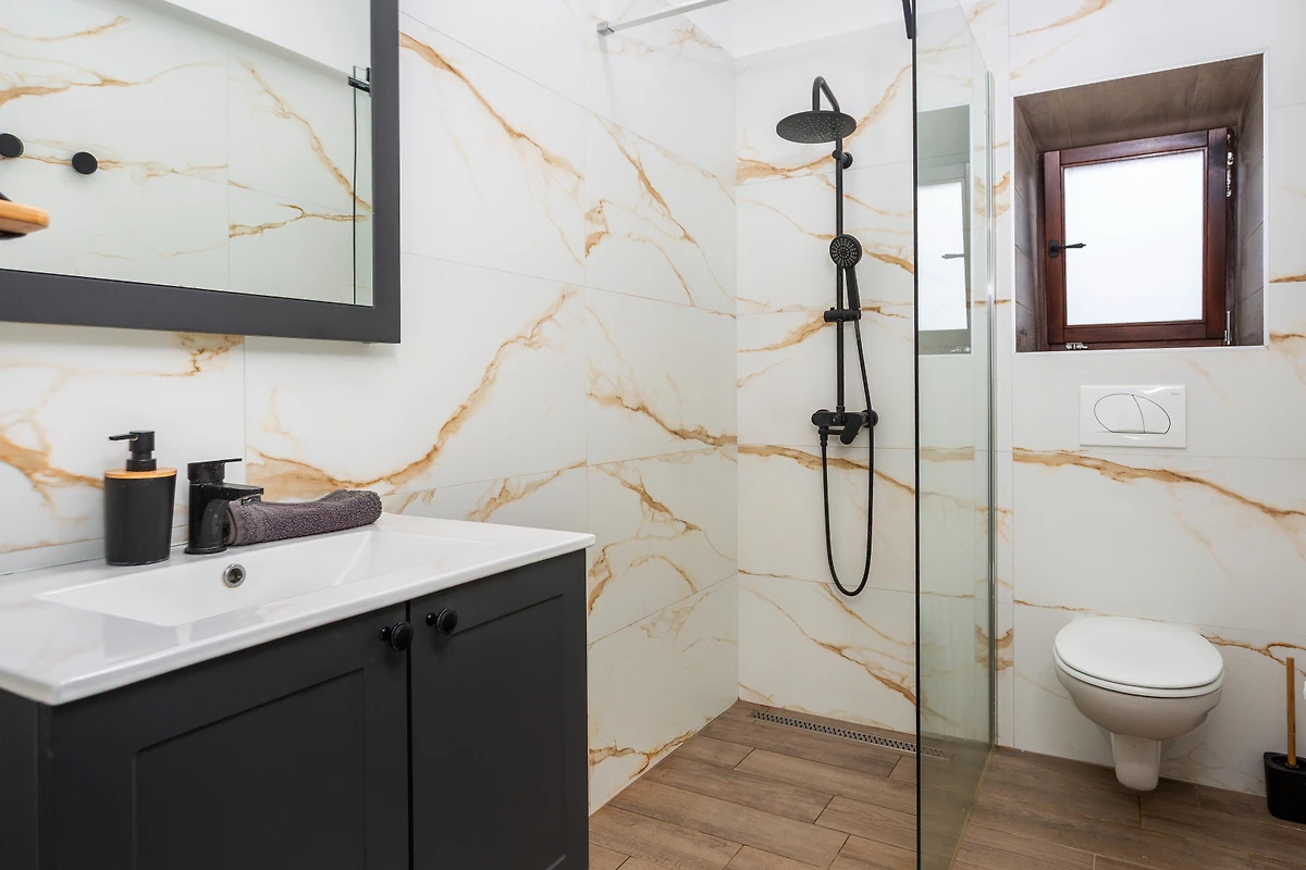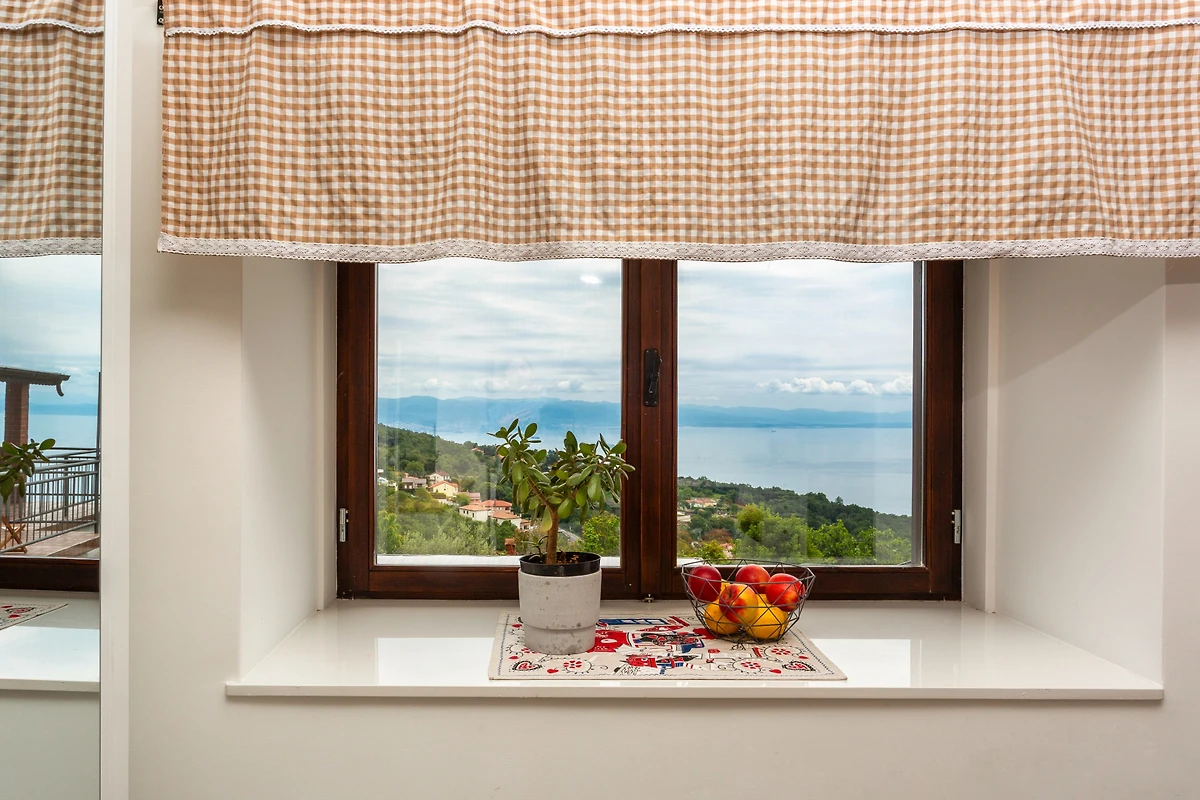 Das Innere dieses Ferienhauses ist 85 m² gross und erstreckt sich über 2 Etagen. Im 1. Stock befindet sich ein Wohn- und Essbereich, der aus einem Wohnzimmer, einer Küche und einem Esszimmer besteht. Die Küche ist mit allem ausgestattet, was Sie zur Zubereitung von Mahlzeiten benötigen, darunter eine Filterkaffeemaschine, ein Toaster, ein Wasserkocher und eine Mikrowelle. Die zubereiteten Mahlzeiten können Sie am Esstisch geniessen, neben dem sich ein Sofa für 3 Personen befindet. Das Sofa ist ausziehbar (190x140cm) und kann als drittes Doppelbett genutzt werden. Das Zimmer ist klein, aber geräumig genug für eine kleine Familie oder ein Paar, um ein gemütliches Beisammensein zu geniessen. Es ist mit rustikalen Deckenbalken ausgestattet und wird durch den Meerblick, der sich durch das Fenster erstreckt, noch aufgewertet. Das Zimmer ist klimatisiert.