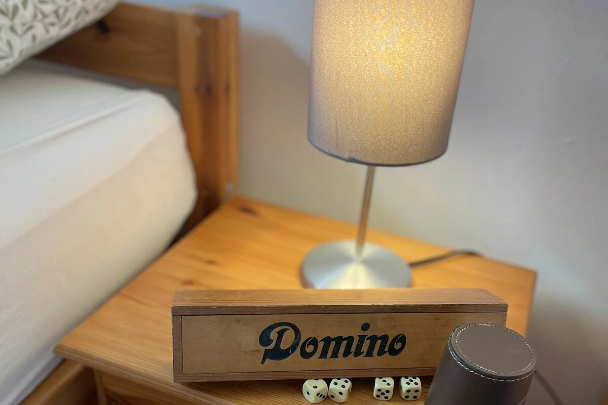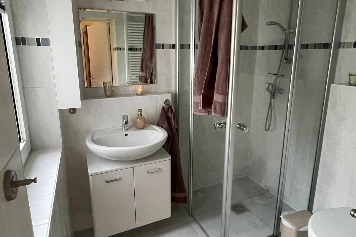 einen Schlafraum mit Doppelbett und Kinderbett und einen Schlafraum mit zwei Einzelbetten und ein Duschbad. Das Badezimmer ist über das erste Schlafzimmer zu erreichen.