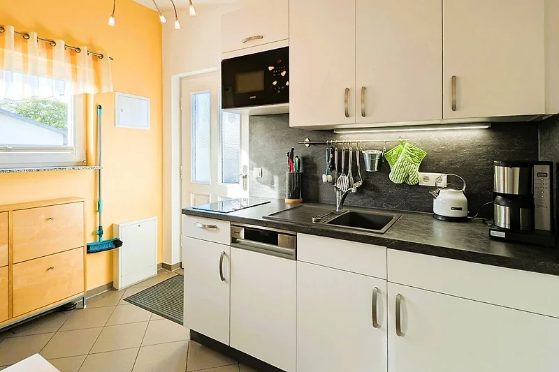 DieKüchenzeile bietet alles, was Sie für Ihren Aufenthalt benötigen: einen Kühlschrank, eine Mikrowelle, eine Kaffeemaschine und zwei Herdplatten, Spülmaschine sowie einen Esstisch für zwei Personen.