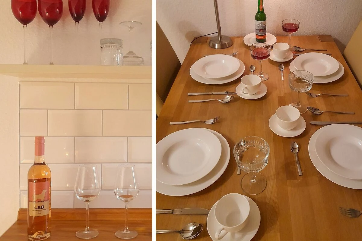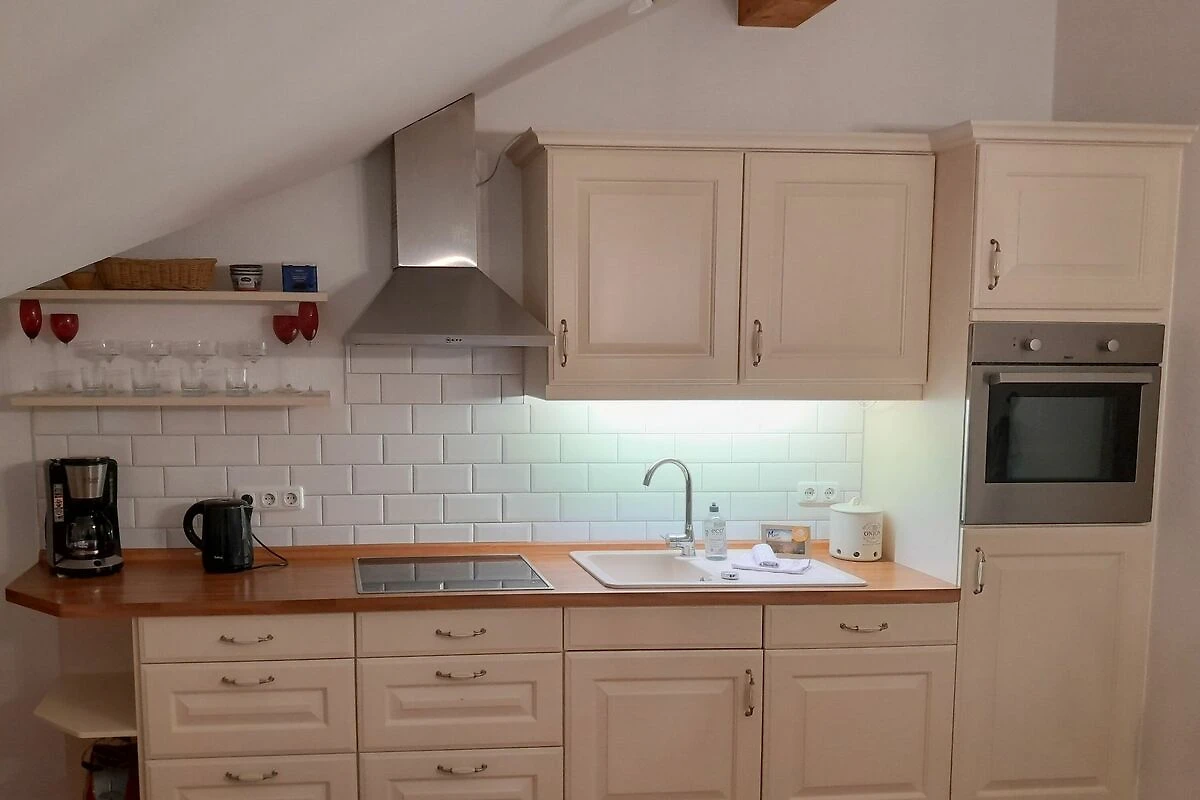 Herzstück Ihres Zuhauses auf Zeit ist das kombinierte Wohn- und Esszimmer mit integrierter Landhaus-Küche und vorgelagertem Balkon. Zur Ausstattung zählen hier u.a. ein Flachbild-TV, kostenfreies W-LAN und eine bequeme Couch. Die offene Küche ist komplett ausgestattet und verfügt u.a. über einen Ceranherd, einen Backofen, eine Geschirrspülmaschine, eine Mikrowelle, einen Kühlschrank sowie Kaffeemaschine, Wasserkocher, Toaster, Stabmixer usw. Speisen können Sie ganz nach Belieben am grossen Esstisch im Wohnzimmer oder auch draussen auf dem überdachten Balkon in der frischen Ostseeluft.