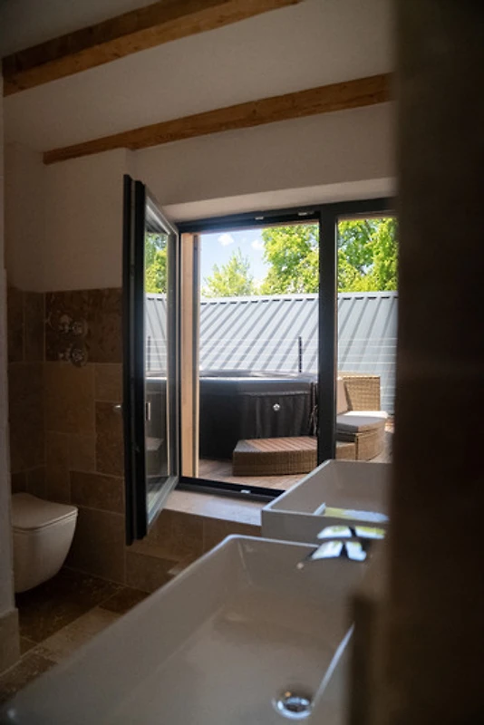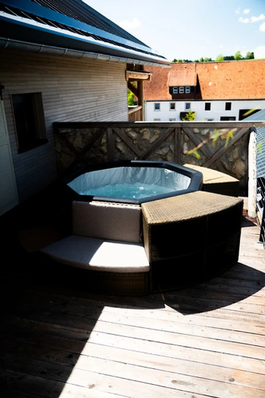 Der Whirlpool auf der Terrasse sorgt für das Wellnessfeeling.
