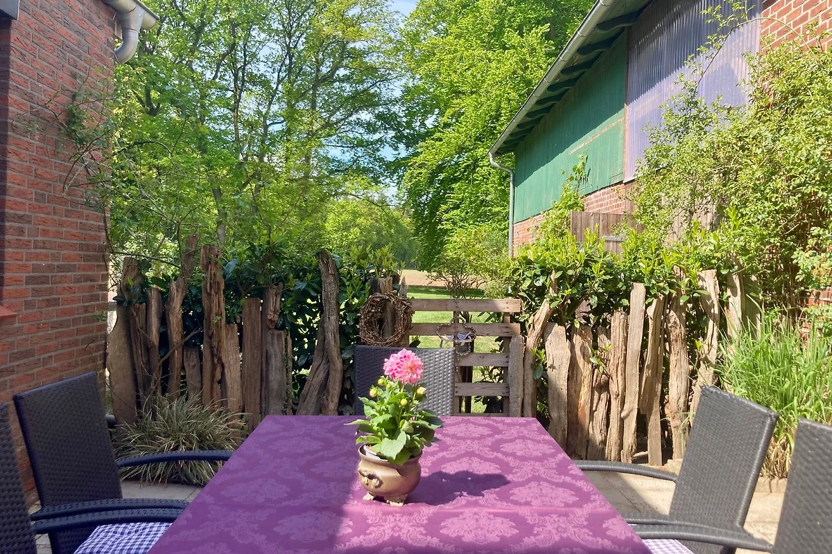 Diese Ferienwohnung verfügt über eine eigene sicht- und windgeschützte Terrasse mit Mobiliar und Elektrogrill. Weiterhin steht dieser Wohnung mit einer weiteren Wohnung im Obergeschoss eine grosse, überdachte Terrasse in angrenzender Scheune zur gemeinsamen Nutzung zur Verfügung (Holzkohlegrill vorhanden).