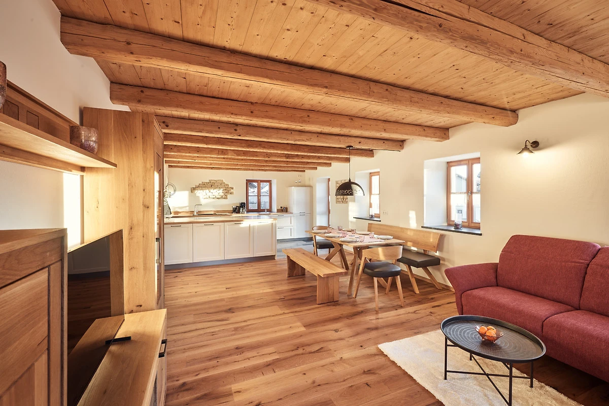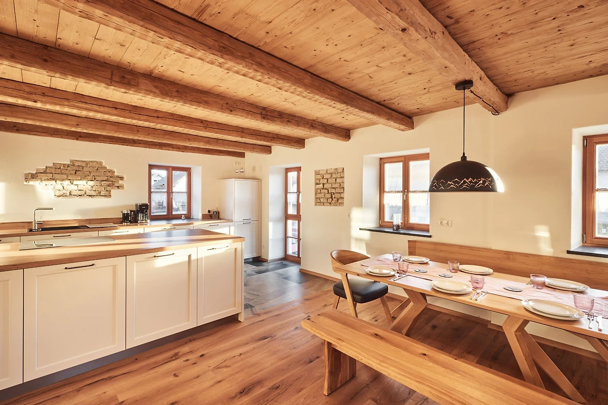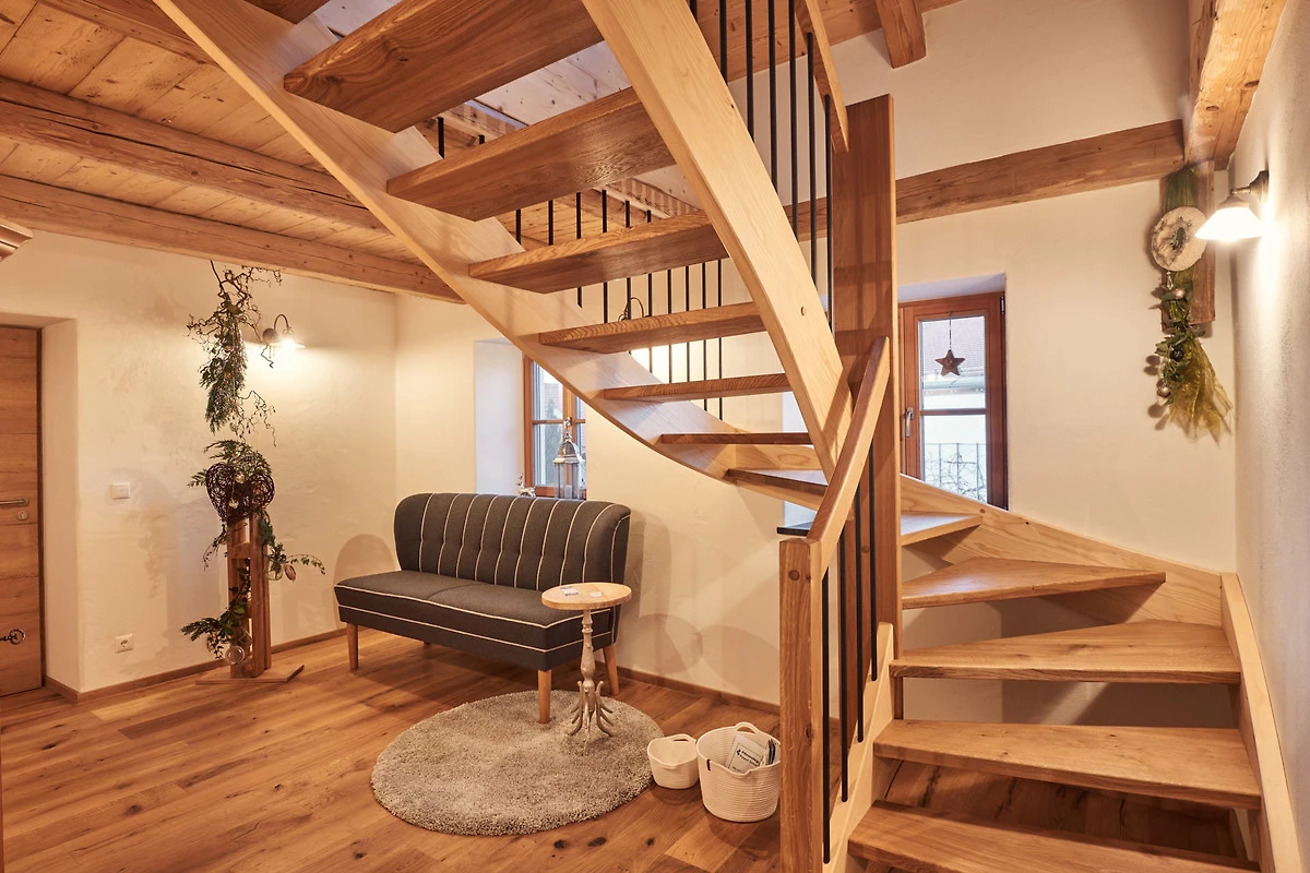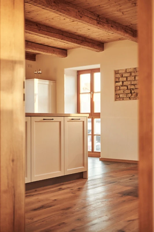 Als Zimmerei war es für uns ein MUSS, den alten Dachstuhl zu erhalten. Er ist in den beiden Schlafzimmern und auch im Badezimmer im Originalzustand (seit 1880) sichtbar. Das Dach und auch die alten dicken Mauern wurden mit nachhaltigem Holz gedämmt. So wartet zusammen mit der Fussbodenheizung und der Lüftungsanlage ein wohlig warmes Klima auf alle Gäste.