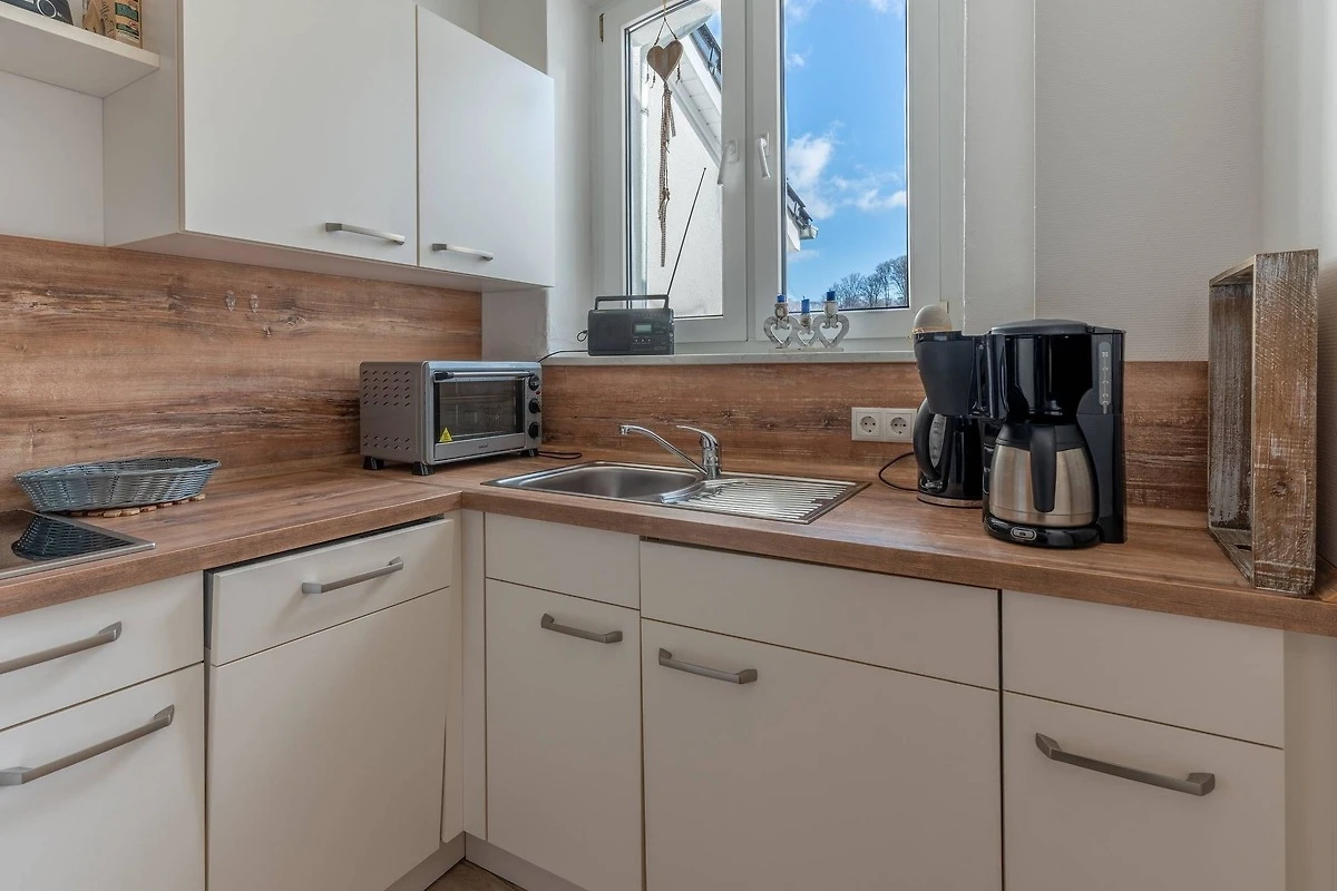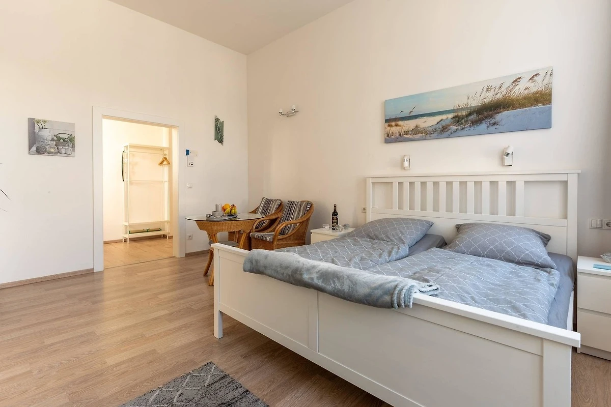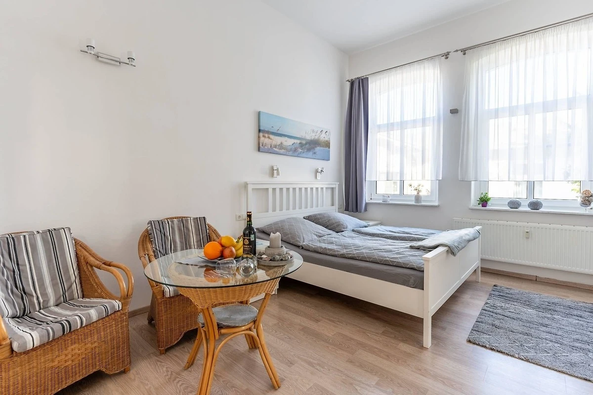 Unsere gemütliche Ferienwohnung 6 bietet auf 36 qm genügend Platz für 2 Personen. Das Apartment befindet sich im 2.OG der Villa Seiler. Eine Aufbettung für ein Kind bis 3 Jahre im Babyreisebett ist möglich. Zum Apartment gehört eine kleine Küchenecke mit Ceranherd (2 Felder), Mikrowelle, Kühlschrank, Kaffeemaschine, Toaster, Wasserkocher und vielem mehr. Im Wohn/Schlafbereich haben Sie ein gemütliches Doppelbett und TV zur Verfügung. Daran anschliessend befindet sich das Tageslichtbad mit Dusche.