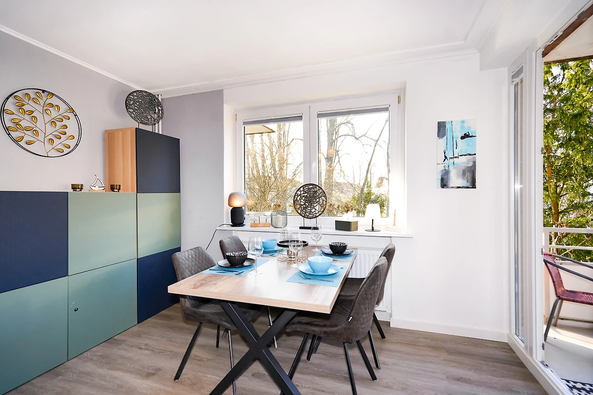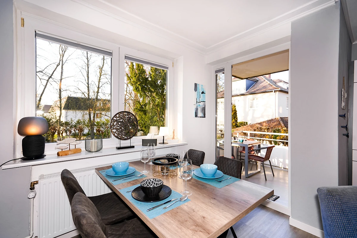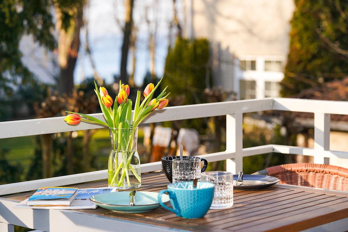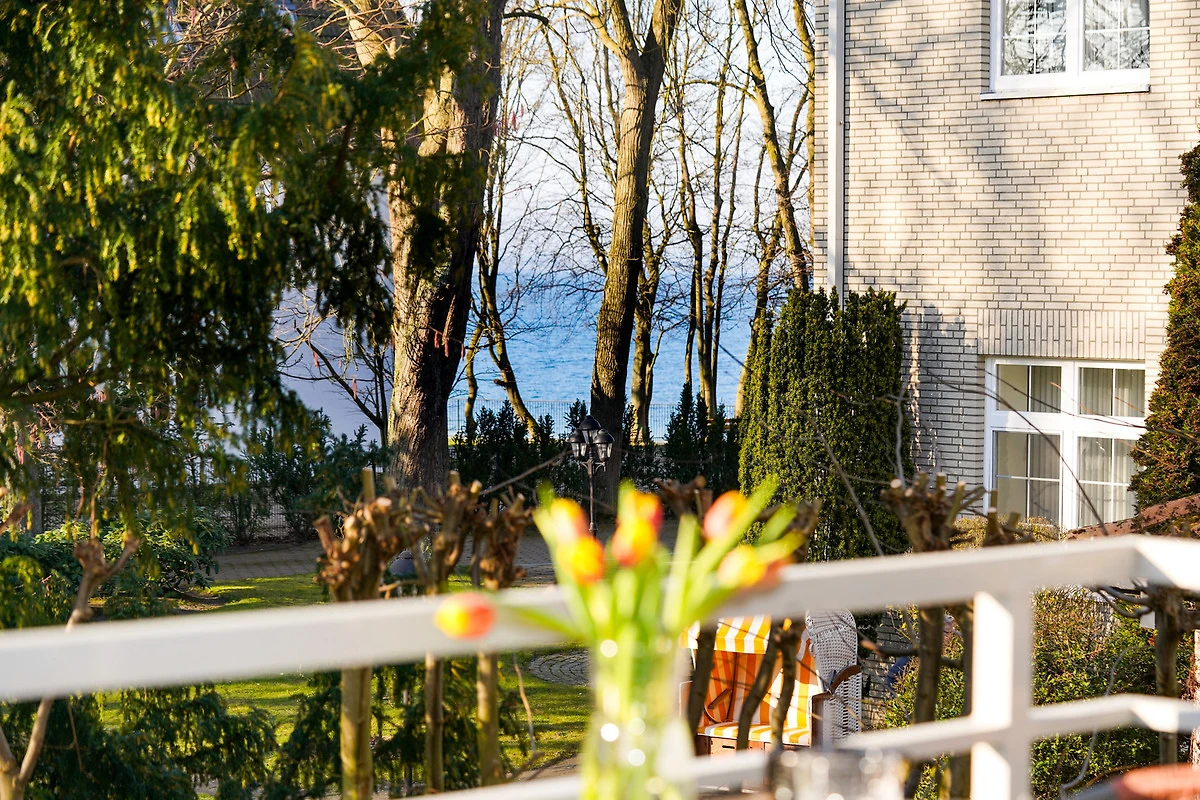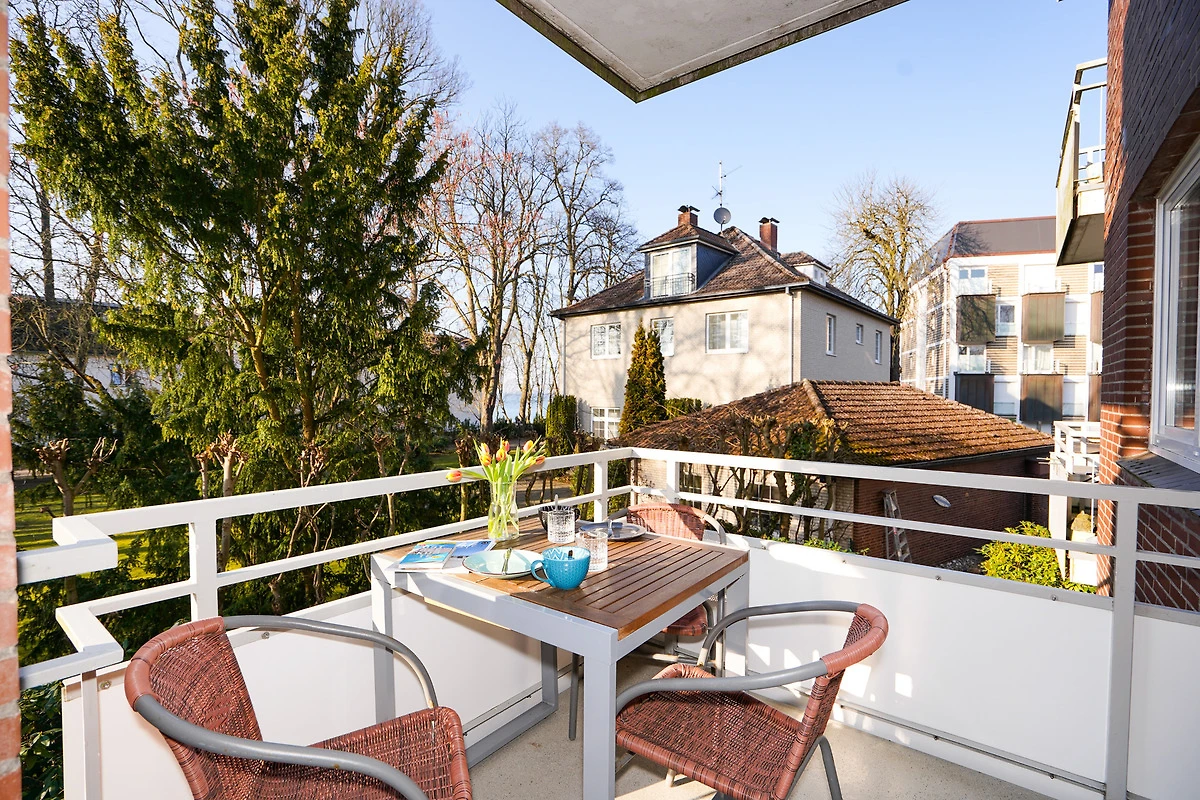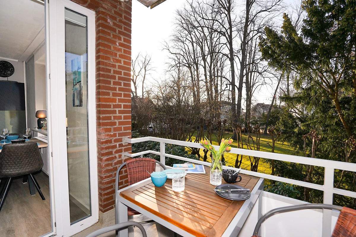 Vom Wohnzimmer aus gelangen Sie auf den Balkon, wo Sie je nach Jahreszeit auch den Blick auf die Ostsee geniessen können.