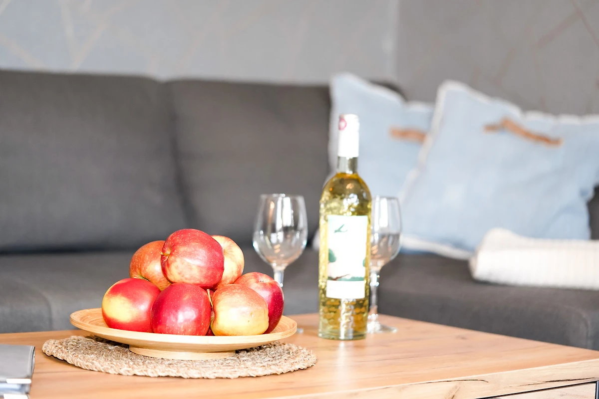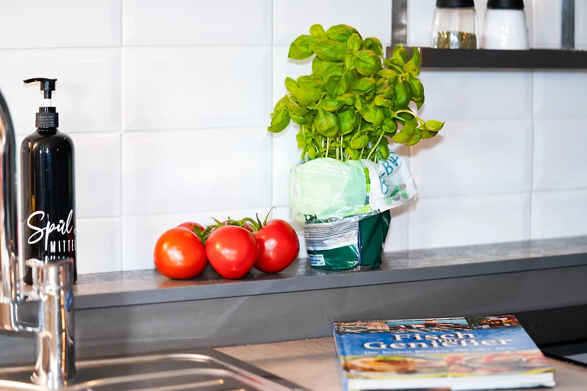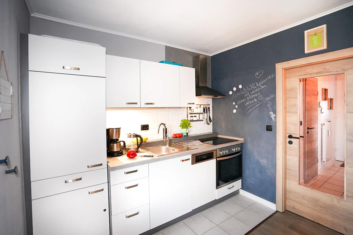 Die helle, moderne Ferienwohnung ist geschmackvoll eingerichtet und verfügt über eine neue Küchenzeile mit Ceranfeld, Backofen, Mikrowelle, Spülmaschine, Kühlschrank mit Gefriermöglichkeit und einer guten Küchenausstattung.