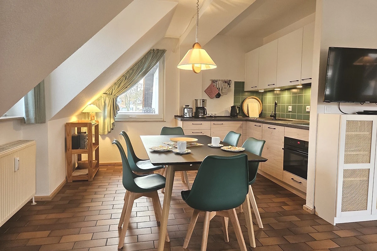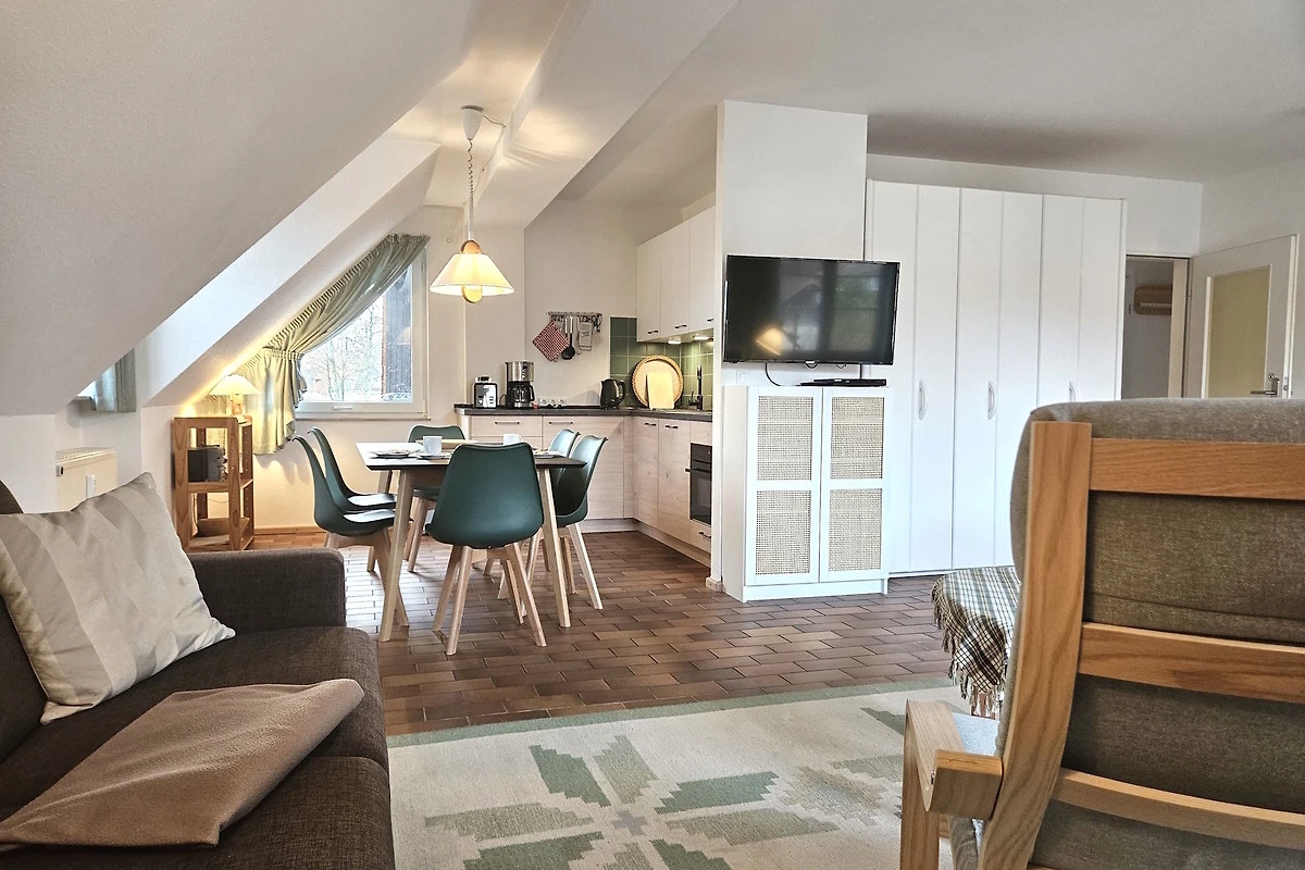 3 Zimmer-Maisonette ca. 75 qm für 2-6 Personen, Haus E in der Residenz Kormoran, Grüne Strasse 45A-R, Ostseebad Prerow. 1.OG: Wohnzimmer mit Schlafcouch, Sitzgarnitur, Kleiderschrank, SAT-TV/Radio, WLAN, Duschbad/WC, Balkon, Essecke mit Küchenzeile (Spülmaschine). 2.OG: 2 Schlafzimmer, 1x Doppelbett, 1x 2 Einzelbetten, Dusche/WC