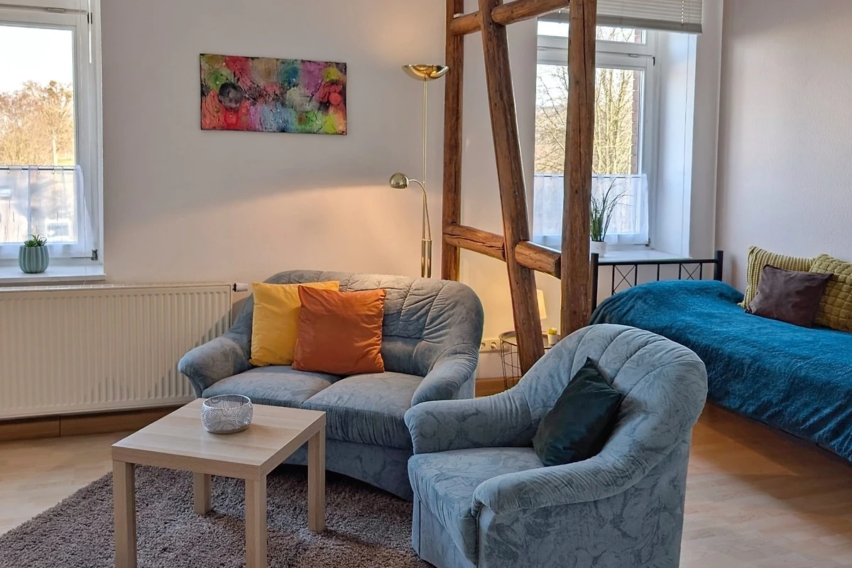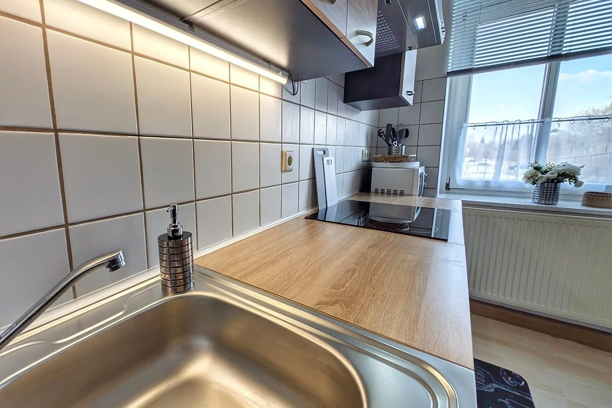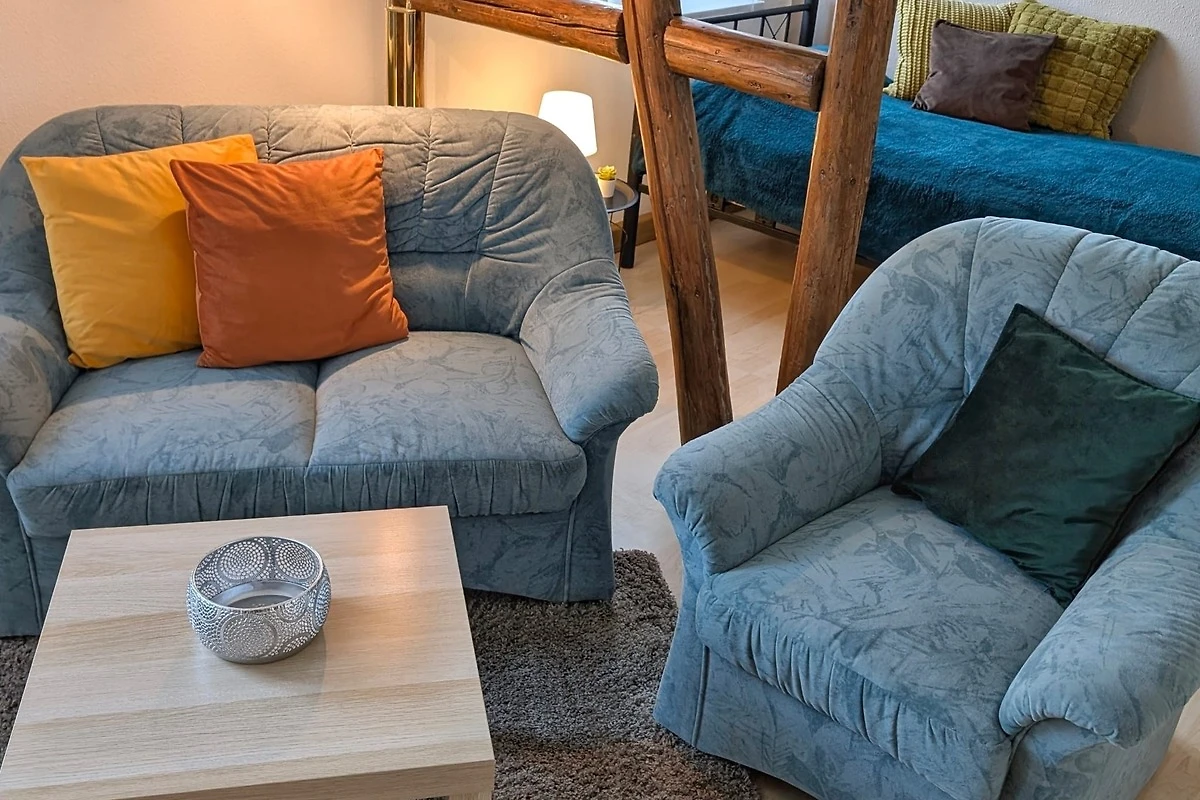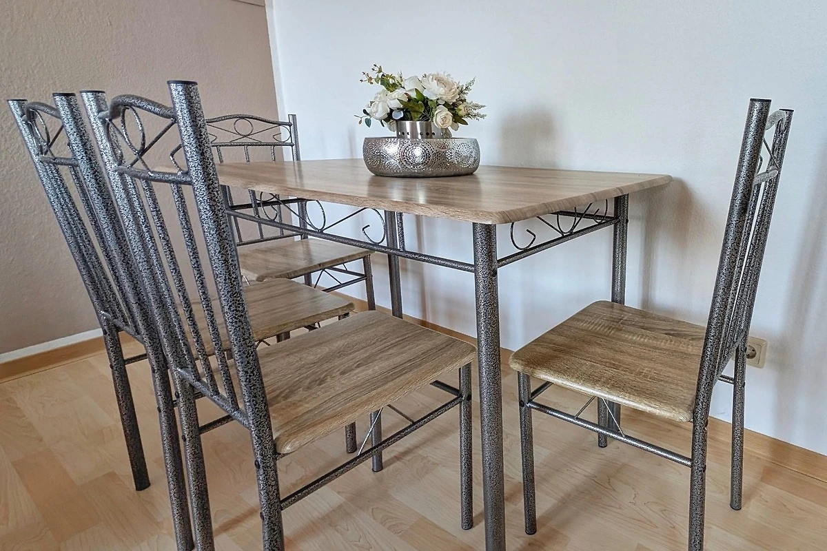 Unsere Ferienwohnung verfügt über ein helles und einladendes Wohnzimmer, das mit komfortablen Möbeln und einem Fernseher ausgestattet ist. Die offene Küche ist modern und komplett ausgestattet, sodass Sie Ihre Lieblingsgerichte zubereiten können. Geniessen Sie Ihre Mahlzeiten am Esstisch, der Platz für bis zu vier Personen bietet.