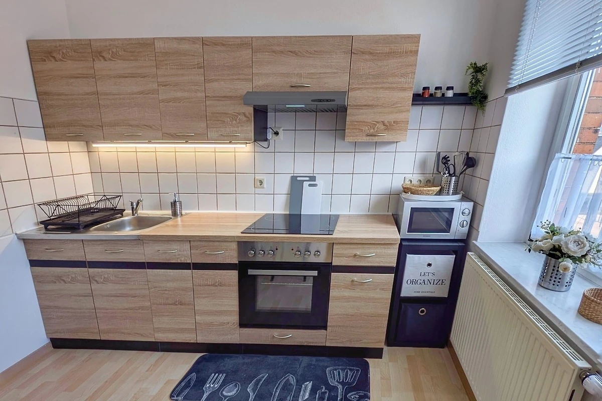 Die Wohnung bietet ein gemütliches Schlafzimmer, das mit einem bequemen Bett ausgestattet ist und für erholsame Nächte sorgt. Das Badezimmer ist modern und verfügt über eine Dusche und Wanne sowie alle notwendigen Annehmlichkeiten.