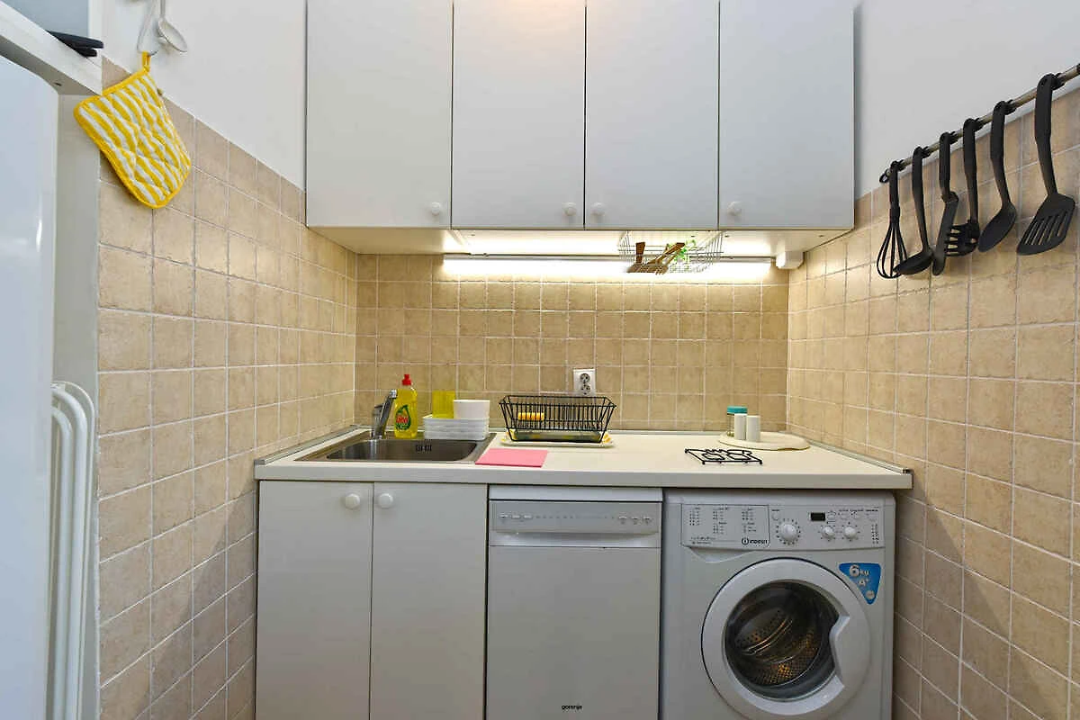 Wohnzimmer (Durchgangszimmer) mit Sitzecke, TV und Essecke. Schlafzimmer mit 1 Doppelbett. Kochecke im Wohnzimmer mit Gasherd, Backofen, Kühlschrank, Mikrowelle, Kaffeemaschine, Toaster, elektrischem Wasserkocher und Waschmaschine. Bad mit Dusche, WC, Bidet, Föhn und Fenster.