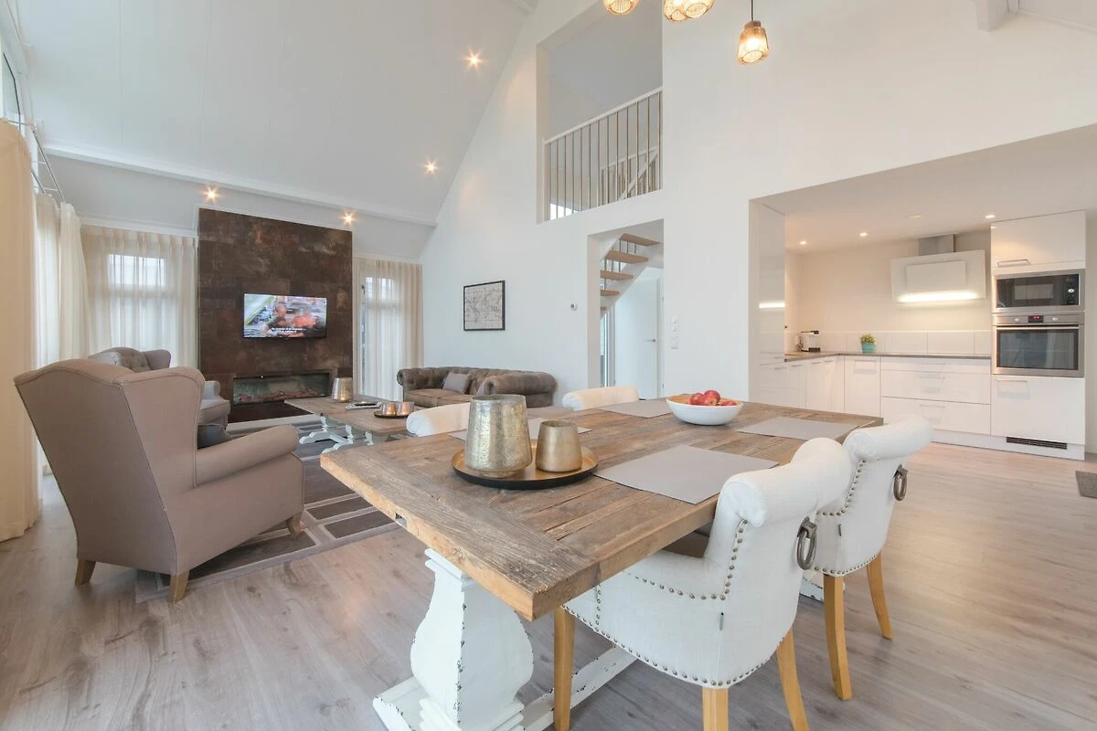 Parterre: (Eingangshalle(Toilette), offene Küche(Wasserkocher, Kaffeemaschine, Backofen, Mikrowelle, Spülmaschine), Wohn/Esszimmer(TV(flatscreen), Dekokamin), Schlafzimmer mit Badezimmer(Doppelbett, Dusche, Waschbecken, Toilette))