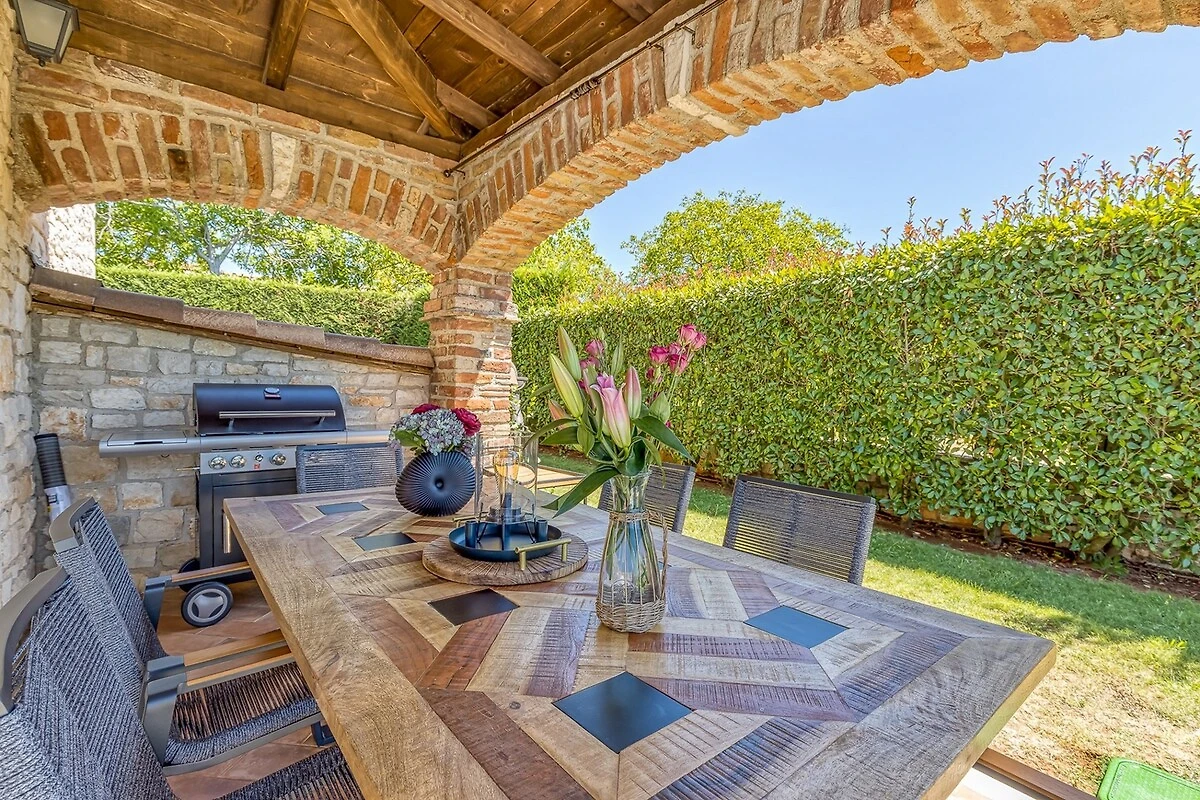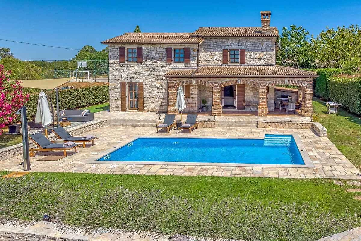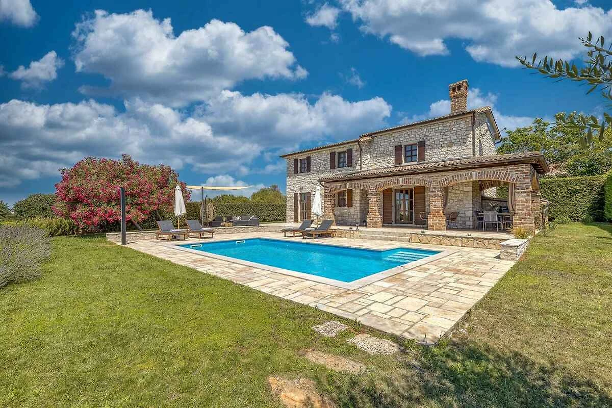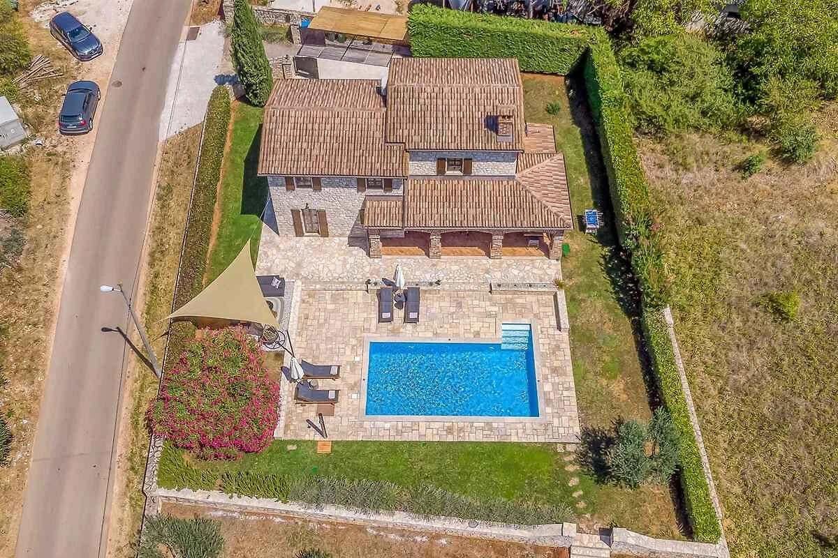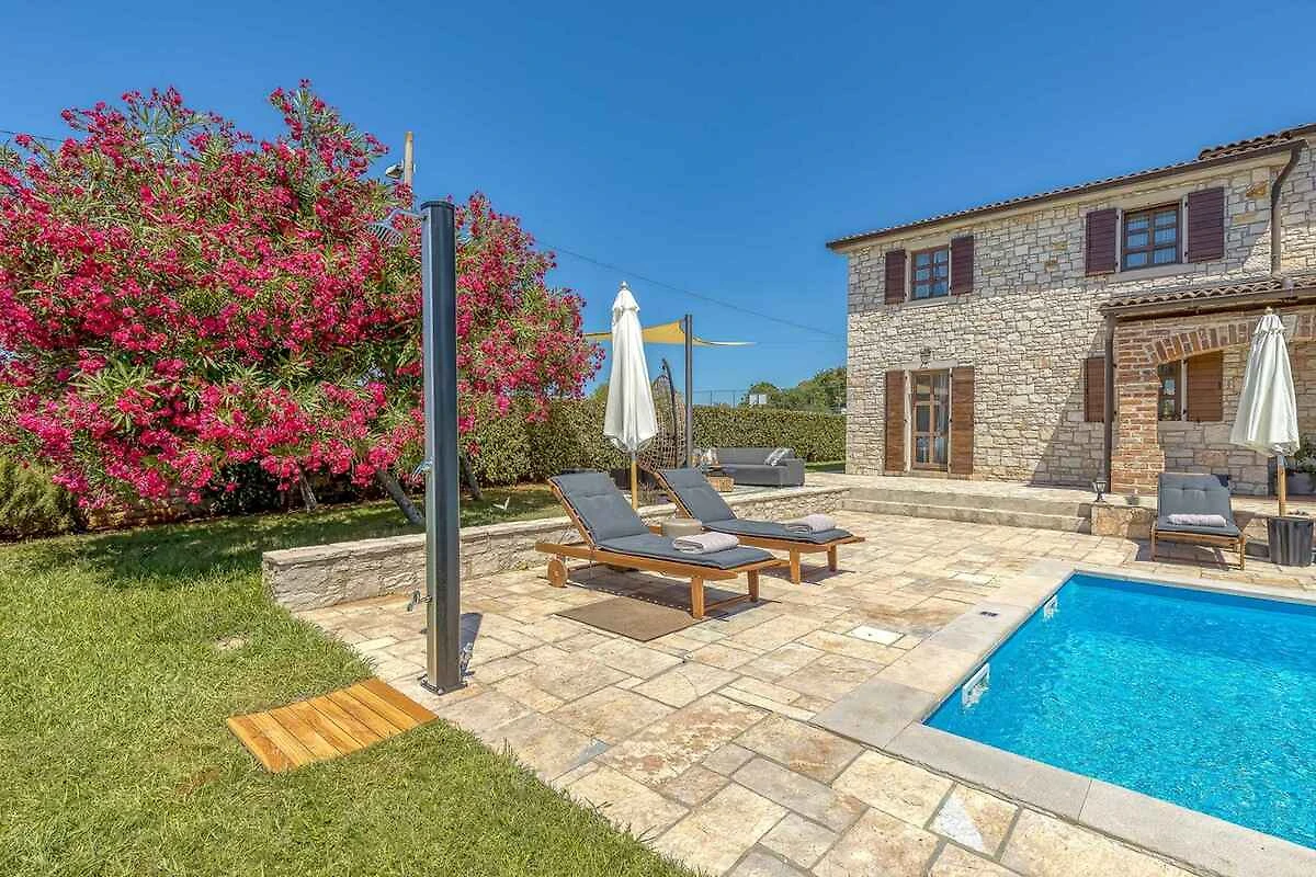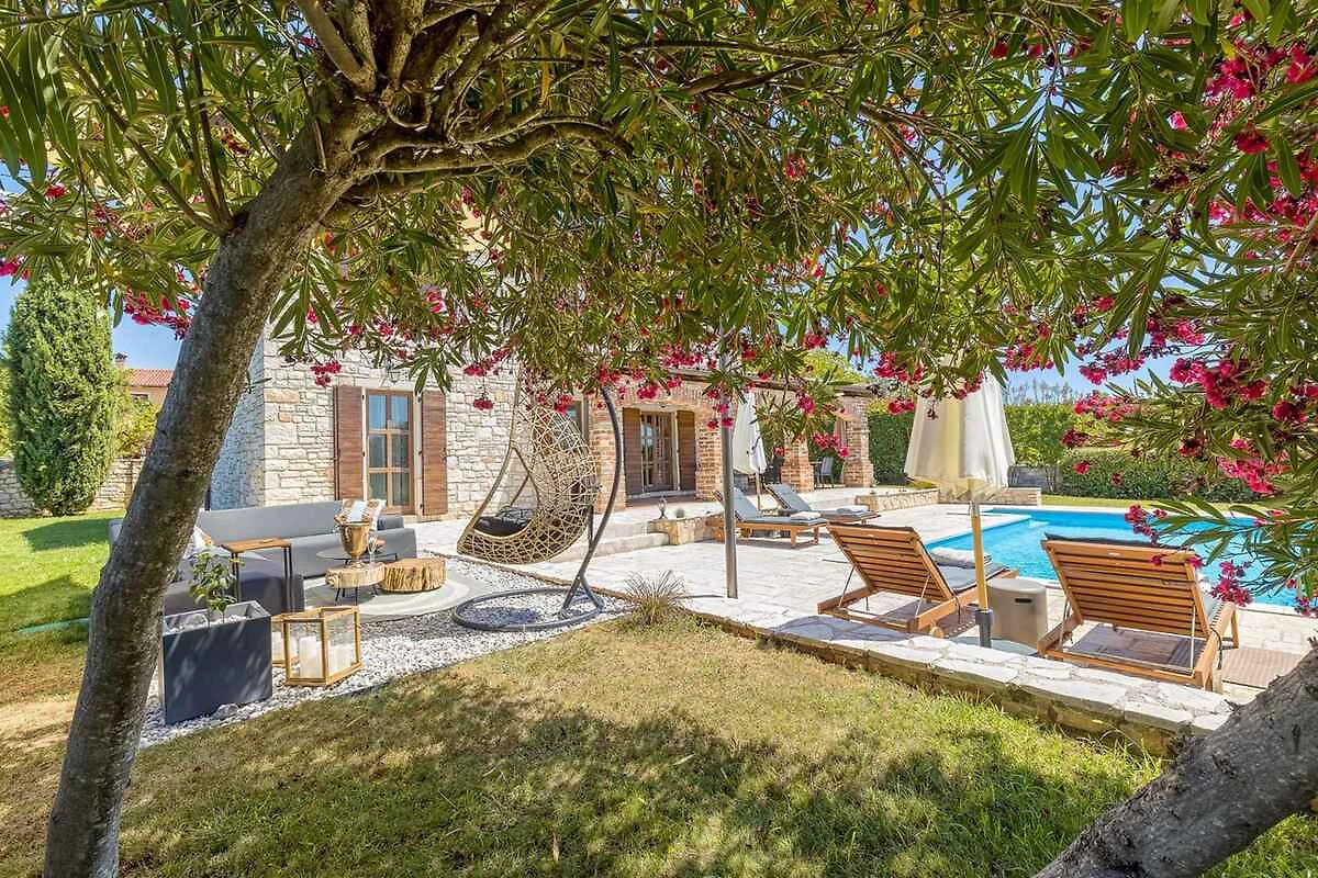 Baderna. Die Villa befindet sich auf einem geschlossenen Gartengrundstück mit Wiese, Blumen, Sträuchern und Bäumen, von einem Zaun begrenzt. Der Vermieter wohnt nicht im Haus oder auf dem Grundstück. Die Zufahrt erfolgt über eine Nebenstrasse (asphaltiert). Parkplatz auf dem Grundstück.