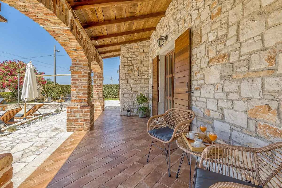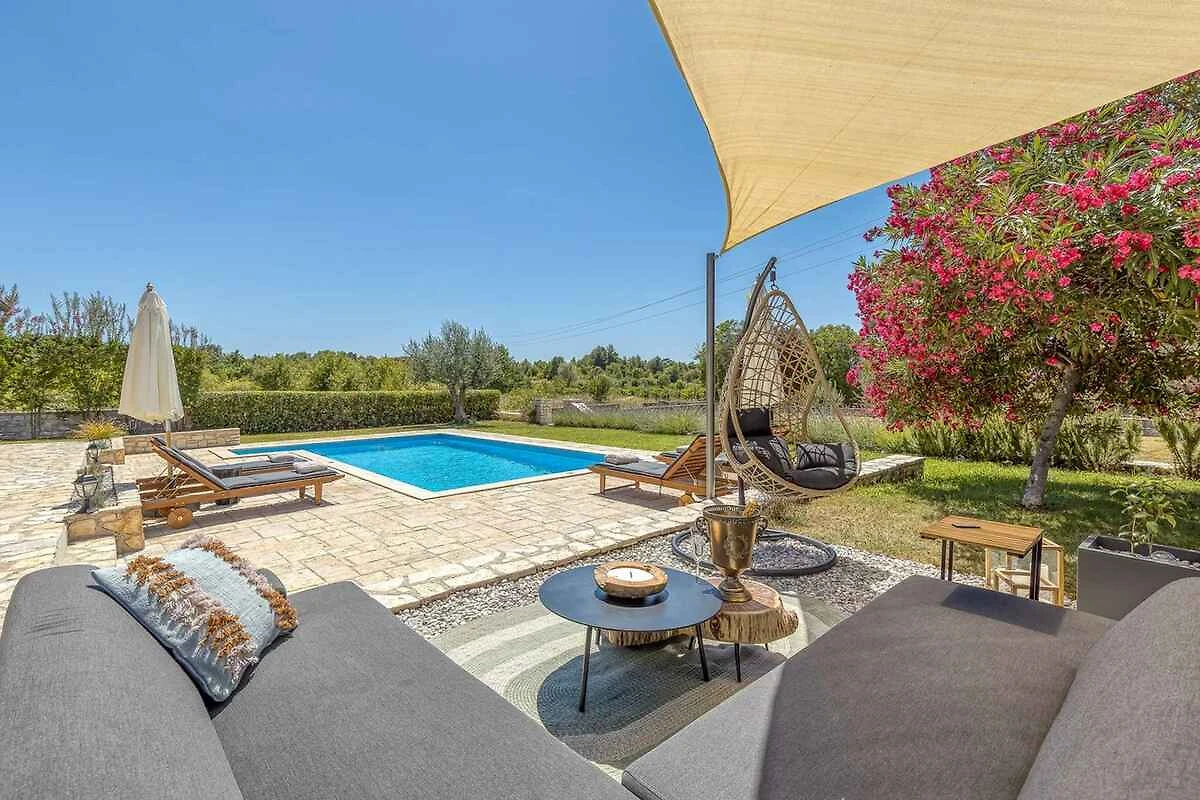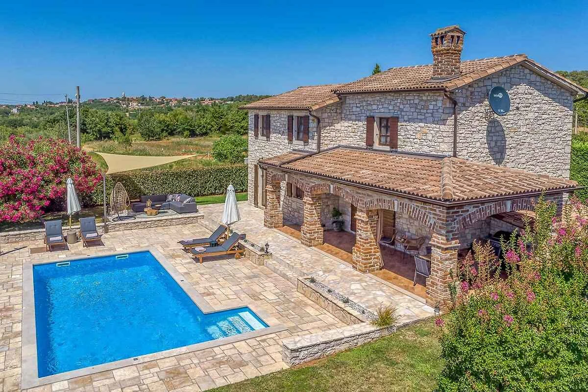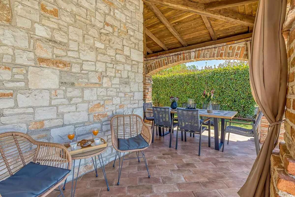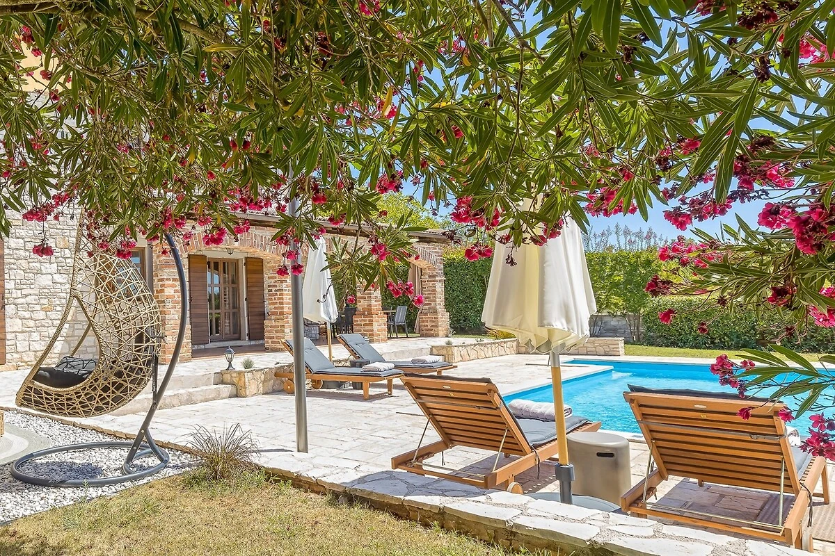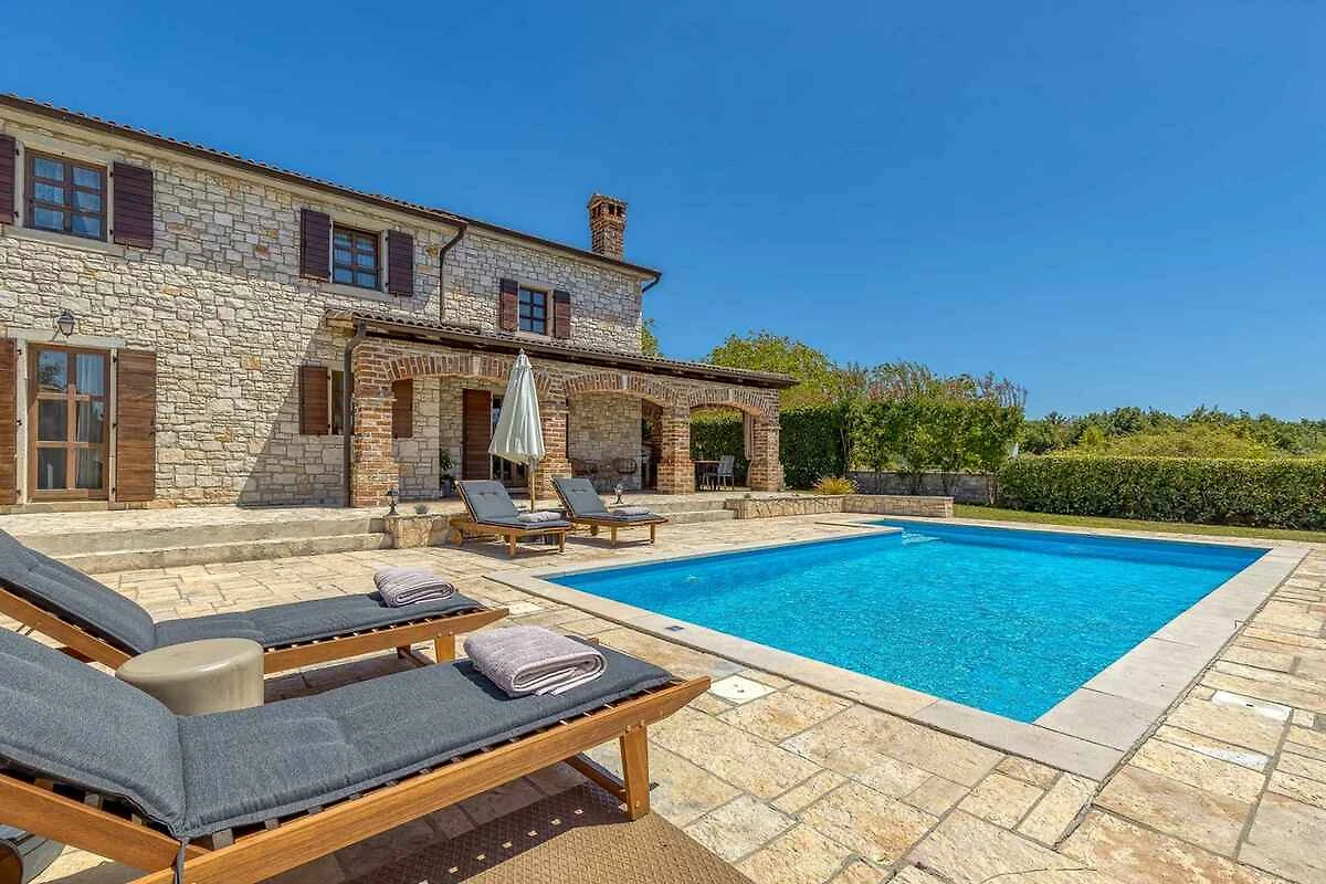 Baderna. Die Villa befindet sich auf einem geschlossenen Gartengrundstück mit Wiese, Blumen, Sträuchern und Bäumen, von einem Zaun begrenzt. Der Vermieter wohnt nicht im Haus oder auf dem Grundstück. Die Zufahrt erfolgt über eine Nebenstrasse (asphaltiert). Parkplatz auf dem Grundstück.