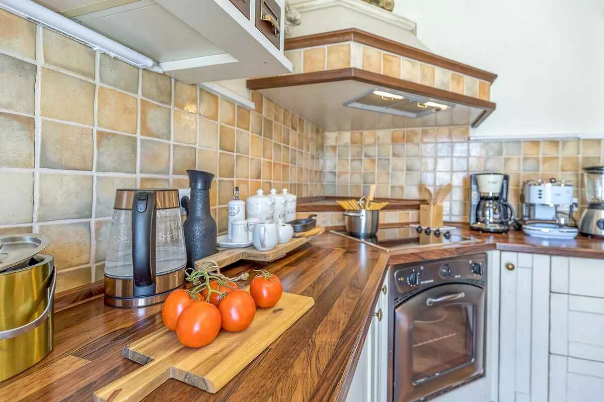 Erdgeschoss: Wohnzimmer mit Sitzecke, TV, Kamin und Zugang zur Terrasse. Küche mit Elektroherd (4 Platten), Backofen, Dunstabzugshaube, Geschirrspüler, Kühlschrank (Eisfach), Mikrowelle, Kaffeemaschine, Toaster und elektrischem Wasserkocher. Separates WC mit WC.