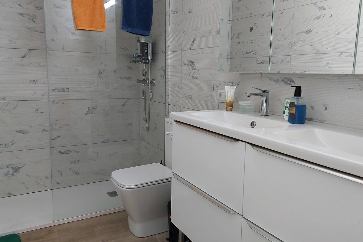 1 Bad mit Doppel-Waschtisch, gr. Dusche und Toilette