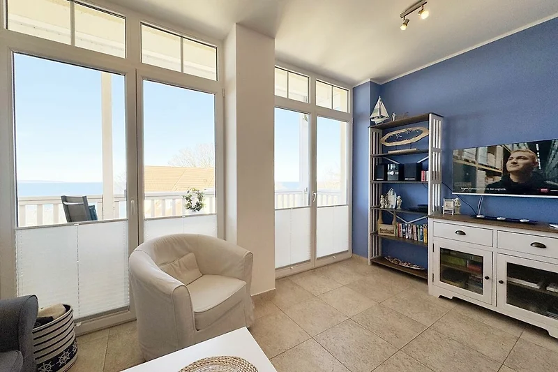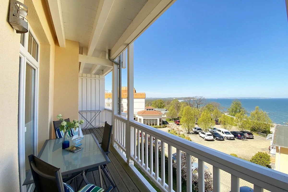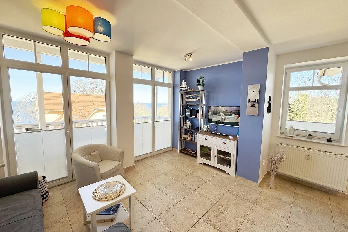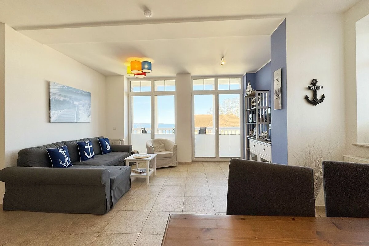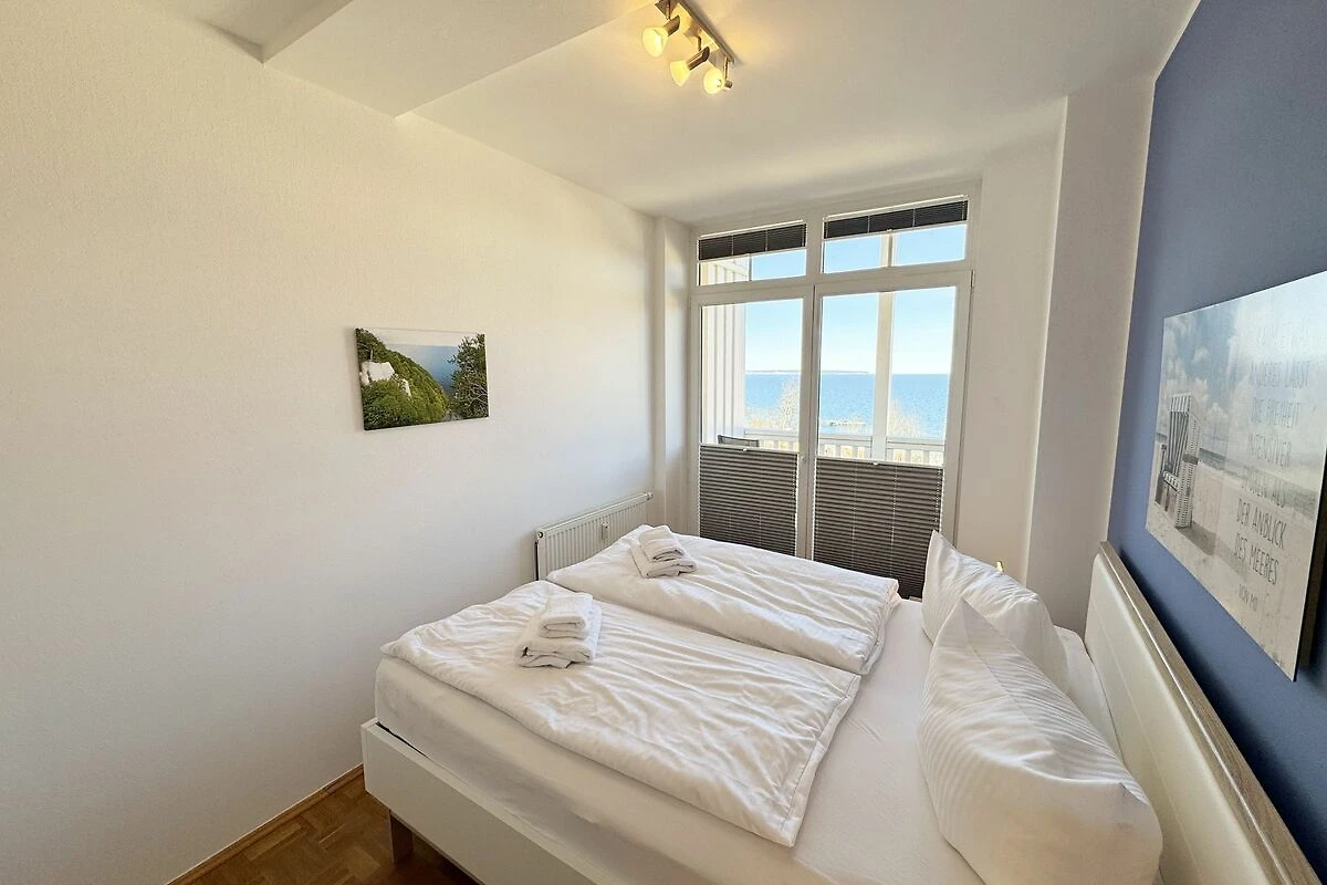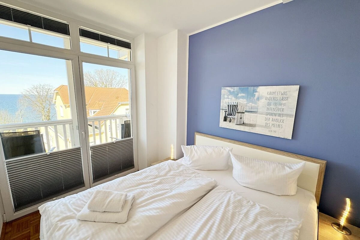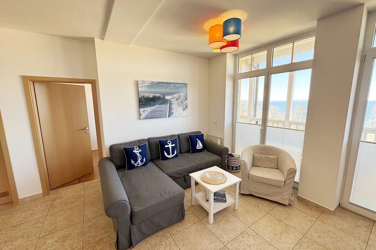 Die komfortable Nichtraucherferienwohnung in der Villa Bergfrieden bietet mit ca. 53 qm Platz für max. 2 bis 4 Personen. Die Wohnung befindet sich in der 1. Etage. Der Wohn- und Essbereich besteht aus einer gemütlichen, ausziehbaren Couchecke (Aufbettungsmöglichkeit für 3./4. Person, 1,40m x 2,00m), einem Couchtisch, einer Anrichte mit einem Smart-TV, einem DVD-Player, einem Radio mit CD-Player sowie einen WLAN-Zugang, welcher für Sie inklusive ist. Abgerundet wird der Bereich mit einer kleinen Auswahl an Gesellschaftsspielen und Urlaubslektüre. Am angrenzenden Essbereich befindet sich eine voll ausgestattete moderne Küchenzeile mit einem Geschirrspüler, einer Spüle, einem Kühlschrank mit Eisfach, einen Backofen mit 4-Zonen-Cerankochfeld, einen Wasserkocher, einer Kaffeemaschine, einen Toaster, einer Cafissimo Maschine sowie diverse Küchenutensilien. Ein Esstisch komplettiert den Bereich. Das helle Schlafzimmer besteht aus einem Doppelbett mit 2 einzelnen Matratzen (1,60m x 2,00m), verstellbare Lattenroste, Nachtischablagen mit Beleuchtung sowie einem Kleiderschrank. Vom Wohnbereich sowie auch vom Schlafzimmer können Sie den bestuhlten Balkon mit Sonnenschirm betreten. Hier haben Sie einen herrlichen Blick auf die Ostsee, wo Sie schon bei Ihrem Frühstück die Aussicht geniessen können. Das innenliegende und geflieste Bad verfügt über eine Dusche, ein WC, einen Kosmetikspiegel und einen Fön. Im kleinen Abstellraum befindet sich ein Staubsauger, ein Wäscheständer, ein Bügelbrett und ein Bügeleisen sowie weitere Reinigungsutensilien. Bis zu 2 Haustiere können Sie gerne gegen eine Gebühr dazu buchen. Ihr PKW-Stellplatz Nr. 06 befindet sich direkt am Haus. Ihre geliehenen oder mitgebrachten Fahrräder können Sie in einem Fahrräderständer direkt vor dem Haus abstellen. Die Erstausstattung eines Wäschepaketes (komplette Bettwäsche, 1 Duschhandtuch, 2 kleine Handtücher) können Sie bis 14 Tage vor der Anreise gegen einen Aufpreis dazu buchen oder durch eigenes Ergänzen. Ab 2 gebuchten Paketen erhalten Sie einmalig 1 Geschirrtuch und einen Duschvorleger dazu.