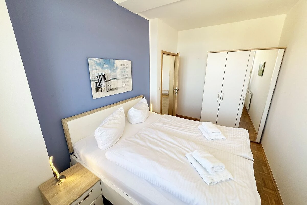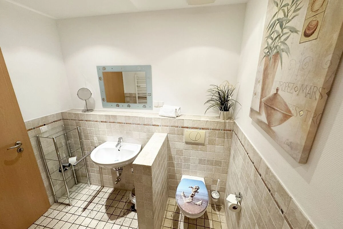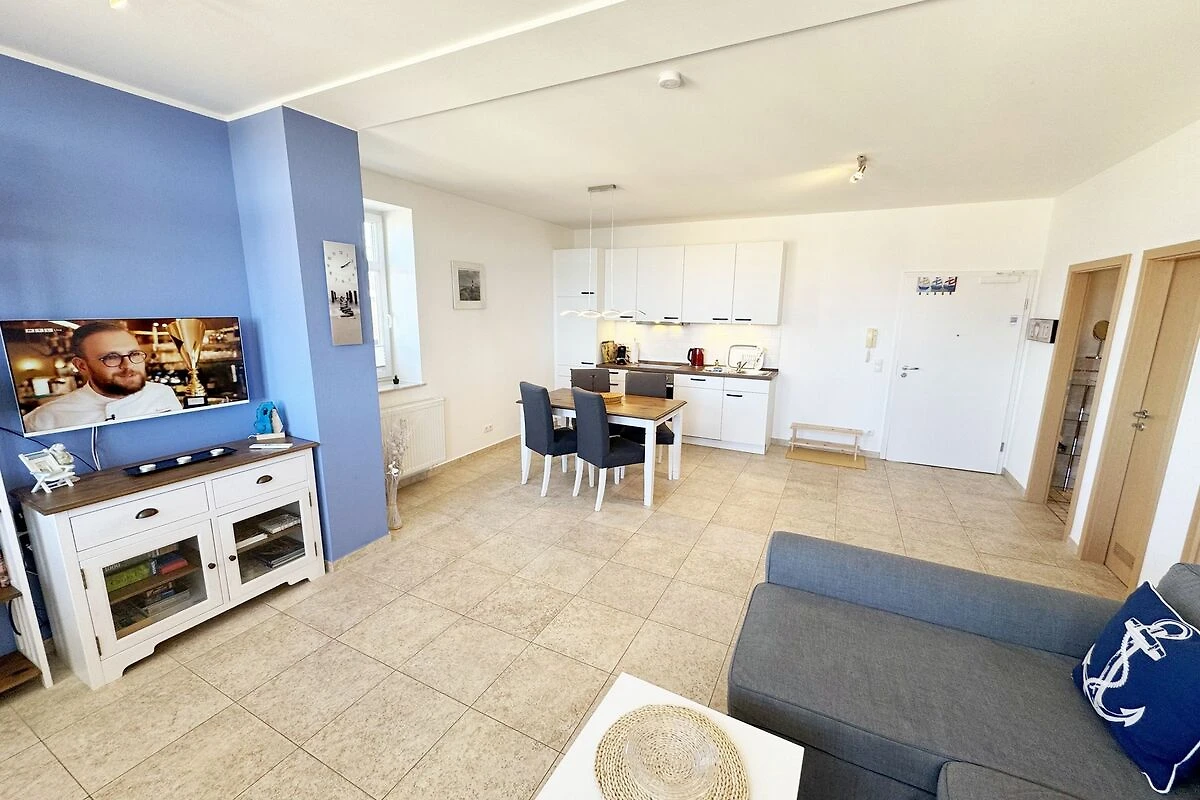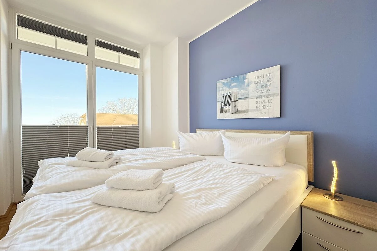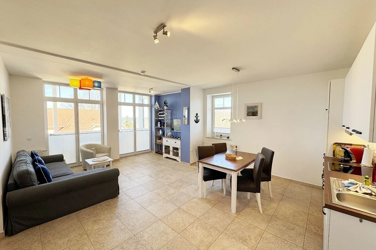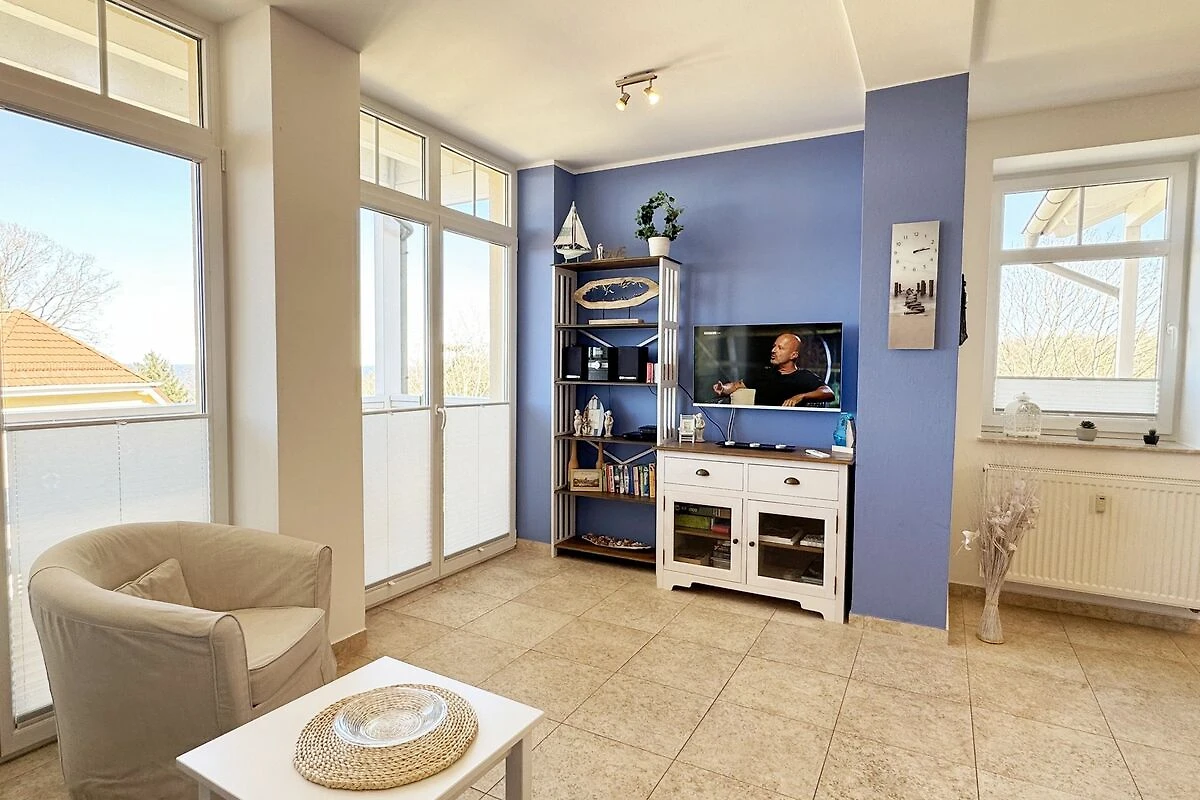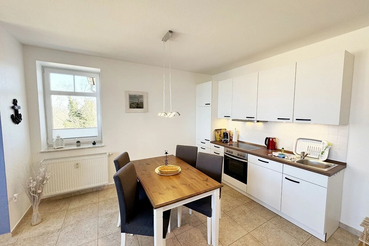 Die komfortable Nichtraucherferienwohnung in der Villa Bergfrieden bietet mit ca. 53 qm Platz für max. 2 bis 4 Personen. Die Wohnung befindet sich in der 1. Etage. Der Wohn- und Essbereich besteht aus einer gemütlichen, ausziehbaren Couchecke (Aufbettungsmöglichkeit für 3./4. Person, 1,40m x 2,00m), einem Couchtisch, einer Anrichte mit einem Smart-TV, einem DVD-Player, einem Radio mit CD-Player sowie einen WLAN-Zugang, welcher für Sie inklusive ist. Abgerundet wird der Bereich mit einer kleinen Auswahl an Gesellschaftsspielen und Urlaubslektüre. Am angrenzenden Essbereich befindet sich eine voll ausgestattete moderne Küchenzeile mit einem Geschirrspüler, einer Spüle, einem Kühlschrank mit Eisfach, einen Backofen mit 4-Zonen-Cerankochfeld, einen Wasserkocher, einer Kaffeemaschine, einen Toaster, einer Cafissimo Maschine sowie diverse Küchenutensilien. Ein Esstisch komplettiert den Bereich. Das helle Schlafzimmer besteht aus einem Doppelbett mit 2 einzelnen Matratzen (1,60m x 2,00m), verstellbare Lattenroste, Nachtischablagen mit Beleuchtung sowie einem Kleiderschrank. Vom Wohnbereich sowie auch vom Schlafzimmer können Sie den bestuhlten Balkon mit Sonnenschirm betreten. Hier haben Sie einen herrlichen Blick auf die Ostsee, wo Sie schon bei Ihrem Frühstück die Aussicht geniessen können. Das innenliegende und geflieste Bad verfügt über eine Dusche, ein WC, einen Kosmetikspiegel und einen Fön. Im kleinen Abstellraum befindet sich ein Staubsauger, ein Wäscheständer, ein Bügelbrett und ein Bügeleisen sowie weitere Reinigungsutensilien. Bis zu 2 Haustiere können Sie gerne gegen eine Gebühr dazu buchen. Ihr PKW-Stellplatz Nr. 06 befindet sich direkt am Haus. Ihre geliehenen oder mitgebrachten Fahrräder können Sie in einem Fahrräderständer direkt vor dem Haus abstellen. Die Erstausstattung eines Wäschepaketes (komplette Bettwäsche, 1 Duschhandtuch, 2 kleine Handtücher) können Sie bis 14 Tage vor der Anreise gegen einen Aufpreis dazu buchen oder durch eigenes Ergänzen. Ab 2 gebuchten Paketen erhalten Sie einmalig 1 Geschirrtuch und einen Duschvorleger dazu.