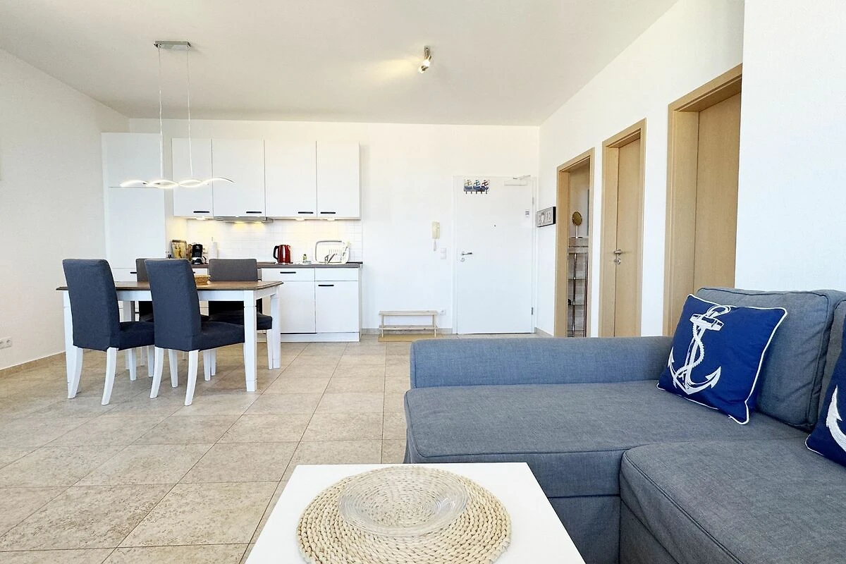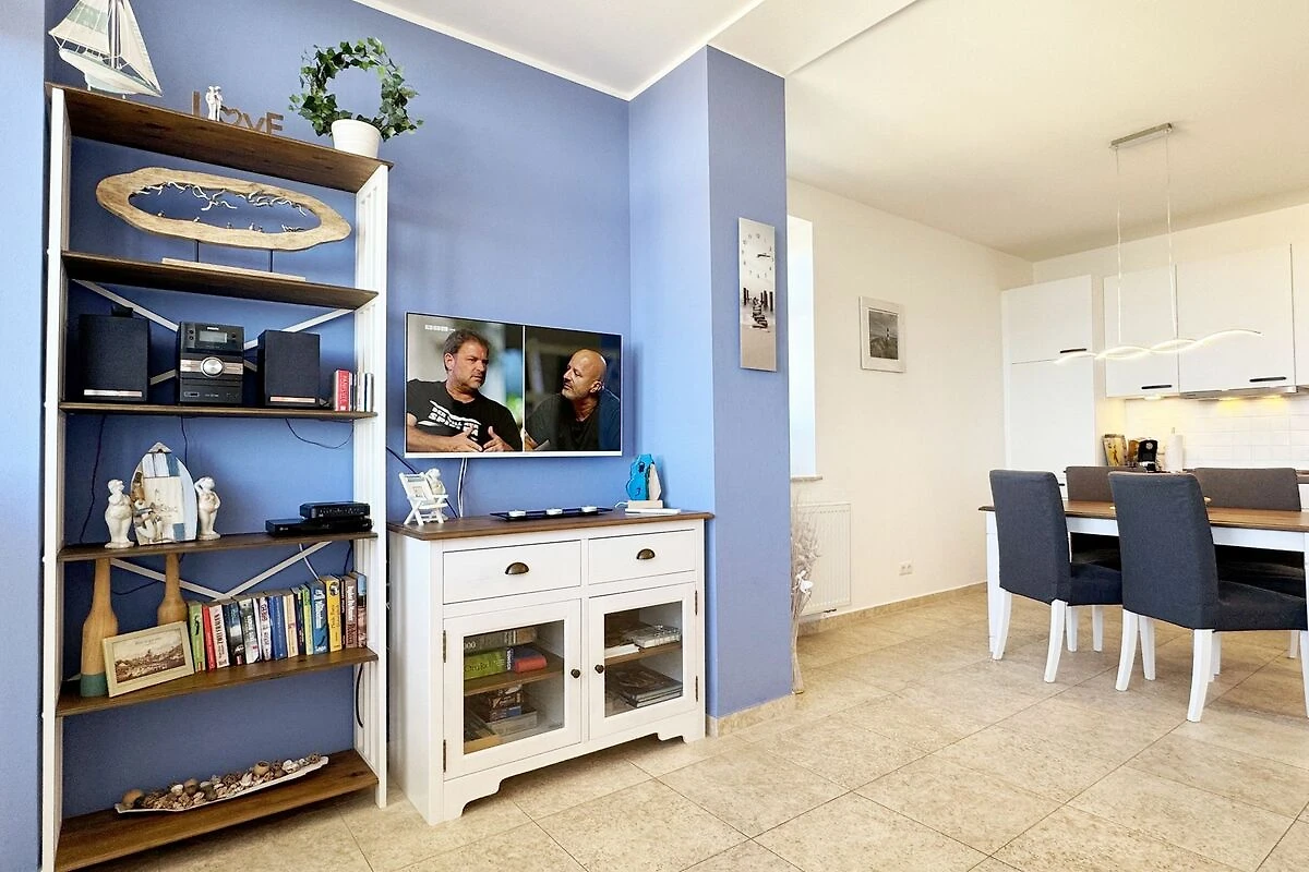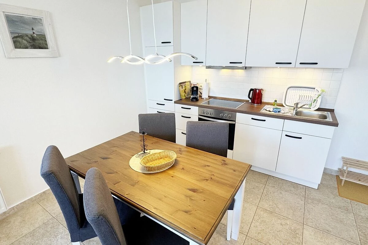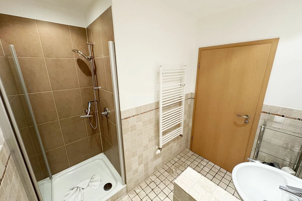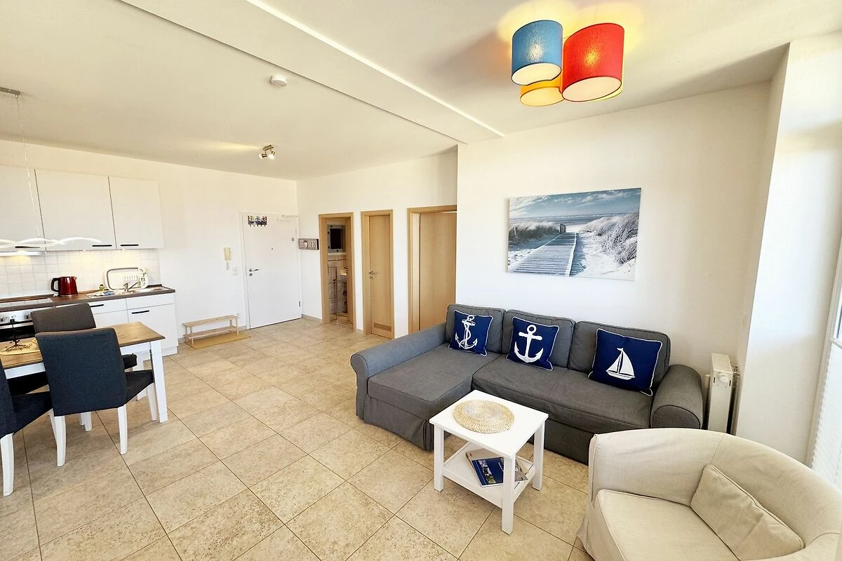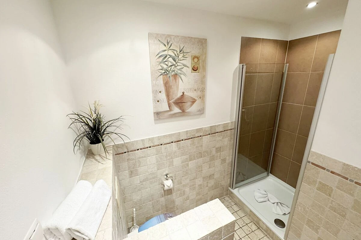 Die komfortable Nichtraucherferienwohnung in der Villa Bergfrieden bietet mit ca. 53 qm Platz für max. 2 bis 4 Personen. Die Wohnung befindet sich in der 1. Etage. Der Wohn- und Essbereich besteht aus einer gemütlichen, ausziehbaren Couchecke (Aufbettungsmöglichkeit für 3./4. Person, 1,40m x 2,00m), einem Couchtisch, einer Anrichte mit einem Smart-TV, einem DVD-Player, einem Radio mit CD-Player sowie einen WLAN-Zugang, welcher für Sie inklusive ist. Abgerundet wird der Bereich mit einer kleinen Auswahl an Gesellschaftsspielen und Urlaubslektüre. Am angrenzenden Essbereich befindet sich eine voll ausgestattete moderne Küchenzeile mit einem Geschirrspüler, einer Spüle, einem Kühlschrank mit Eisfach, einen Backofen mit 4-Zonen-Cerankochfeld, einen Wasserkocher, einer Kaffeemaschine, einen Toaster, einer Cafissimo Maschine sowie diverse Küchenutensilien. Ein Esstisch komplettiert den Bereich. Das helle Schlafzimmer besteht aus einem Doppelbett mit 2 einzelnen Matratzen (1,60m x 2,00m), verstellbare Lattenroste, Nachtischablagen mit Beleuchtung sowie einem Kleiderschrank. Vom Wohnbereich sowie auch vom Schlafzimmer können Sie den bestuhlten Balkon mit Sonnenschirm betreten. Hier haben Sie einen herrlichen Blick auf die Ostsee, wo Sie schon bei Ihrem Frühstück die Aussicht geniessen können. Das innenliegende und geflieste Bad verfügt über eine Dusche, ein WC, einen Kosmetikspiegel und einen Fön. Im kleinen Abstellraum befindet sich ein Staubsauger, ein Wäscheständer, ein Bügelbrett und ein Bügeleisen sowie weitere Reinigungsutensilien. Bis zu 2 Haustiere können Sie gerne gegen eine Gebühr dazu buchen. Ihr PKW-Stellplatz Nr. 06 befindet sich direkt am Haus. Ihre geliehenen oder mitgebrachten Fahrräder können Sie in einem Fahrräderständer direkt vor dem Haus abstellen. Die Erstausstattung eines Wäschepaketes (komplette Bettwäsche, 1 Duschhandtuch, 2 kleine Handtücher) können Sie bis 14 Tage vor der Anreise gegen einen Aufpreis dazu buchen oder durch eigenes Ergänzen. Ab 2 gebuchten Paketen erhalten Sie einmalig 1 Geschirrtuch und einen Duschvorleger dazu.