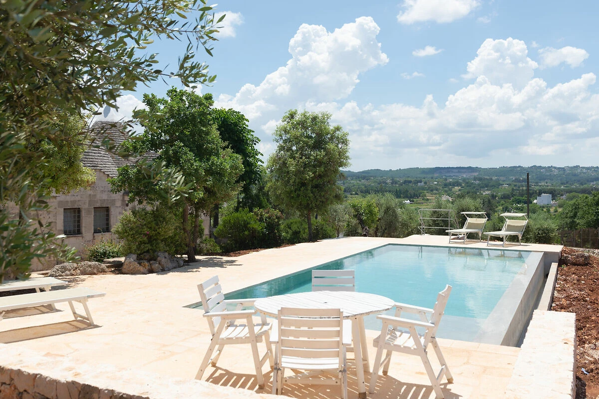 Die Stärke dieser Struktur ist das Äußere, denn sie verfügt über einen 10x4-Panoramapool mit einem atemberaubenden Blick auf das Itria-Tal, welches seinesgleichen sucht, und den herrlichen Pinienwald neben dem Trullo, der zum Spazierengehen und Genießen absoluter Momente einlädt, erholsame Ruhe umgeben von Natur.