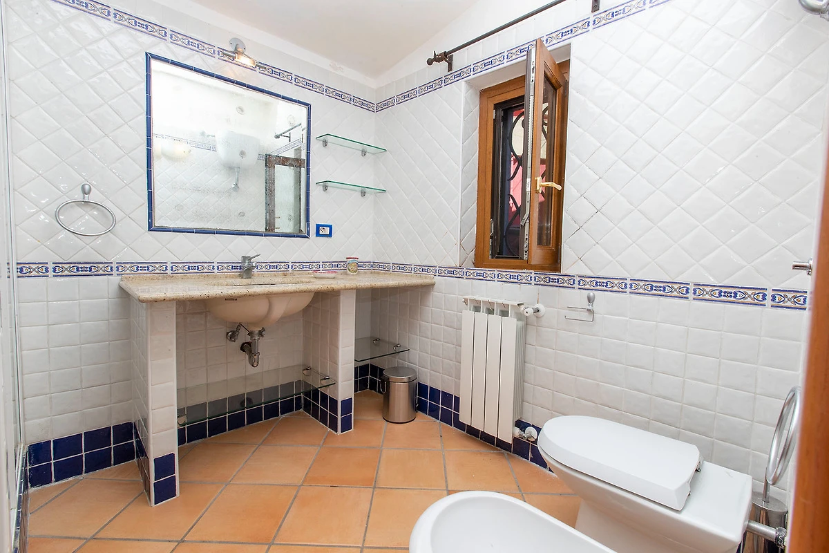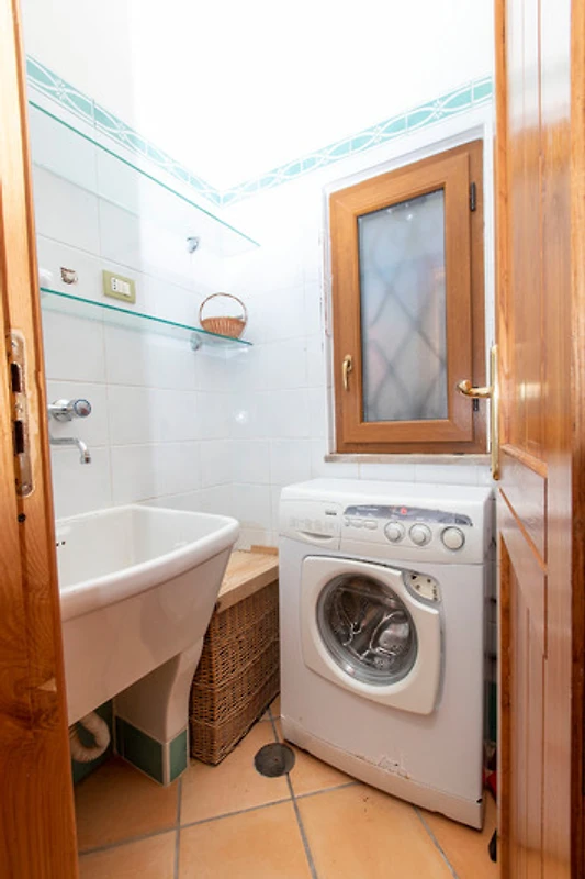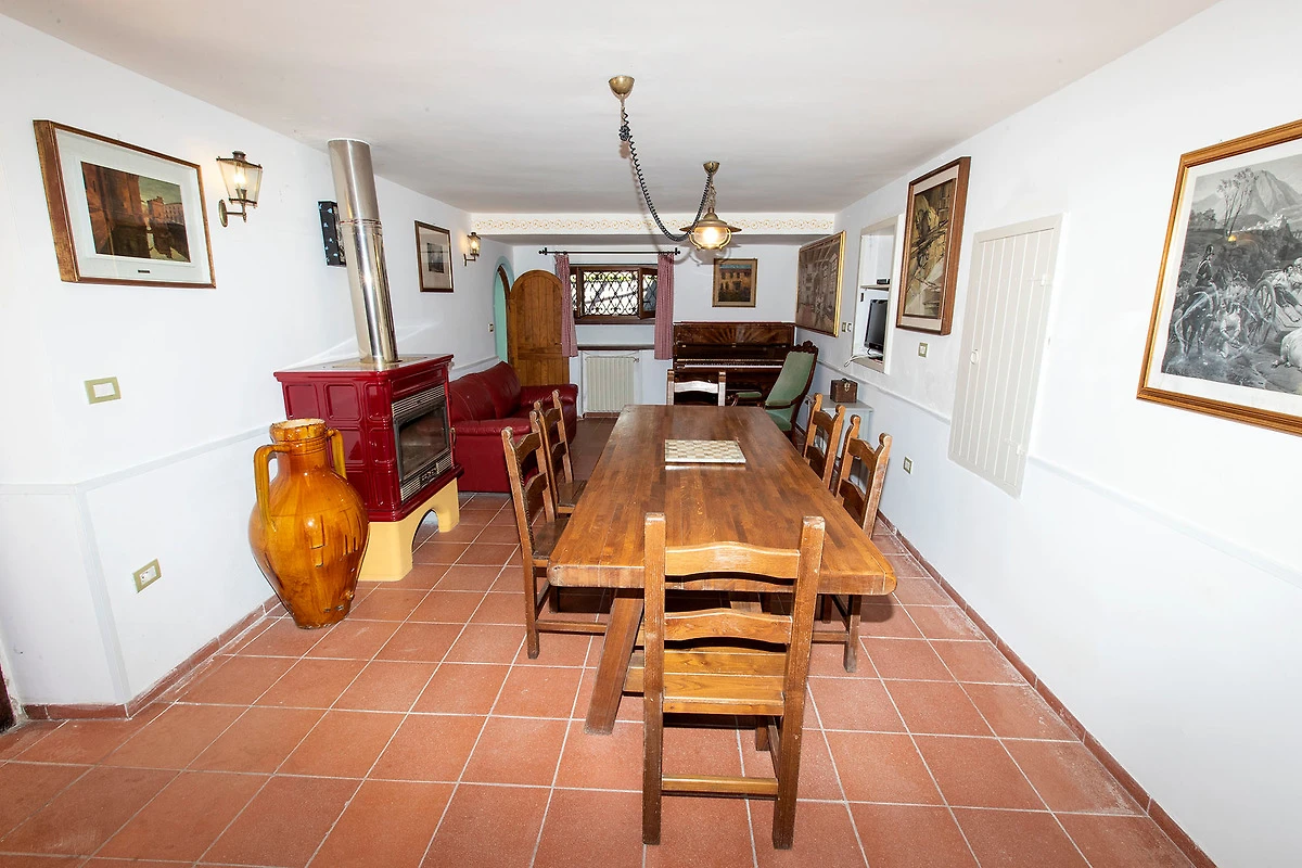 CASA ROSSA (main house) – Casa Rossa’s ground floor includes a dining room with solid wooden dining furniture, a sofa to relax on and TV as well as a rustic-style living room with fireplace. A tastefully furnished kitchen (incl. dishwasher), a bathroom (shower/WC/bidet) and a small utility room with washing machine are also found on the ground floor.