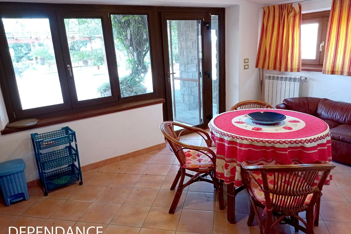 DEPENDANCE – The single-story dependance, which can be rented only in addition to the main house, is characterized by rattan furnishing, has a cozy kitchen-dining-living room with fireplace, 2 bedrooms (double bed; single bed) and a bathroom (shower/WC).