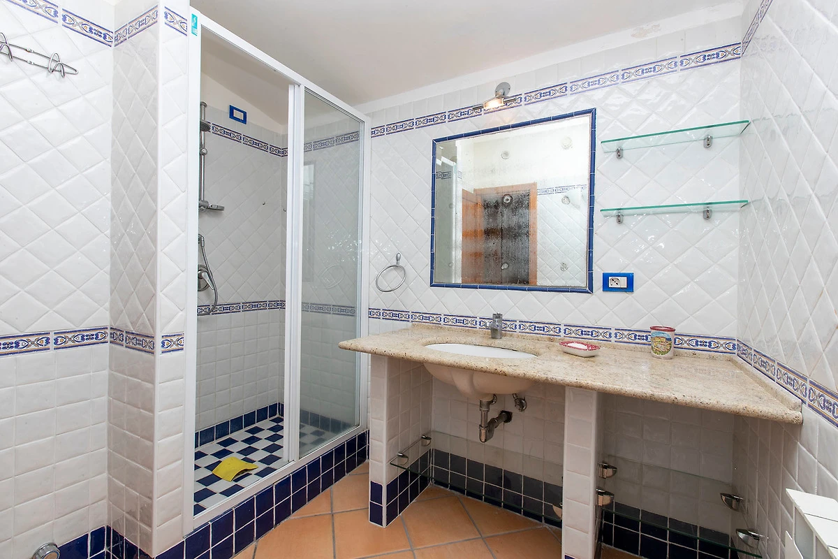 A double bedroom and an open sleeping area with three single beds, both with access of the large sea-view balcony, as well as another bathroom (shower/WC) are found on the 1st floor. The sunny roof terrace with unique sea view is accessible from the balcony.