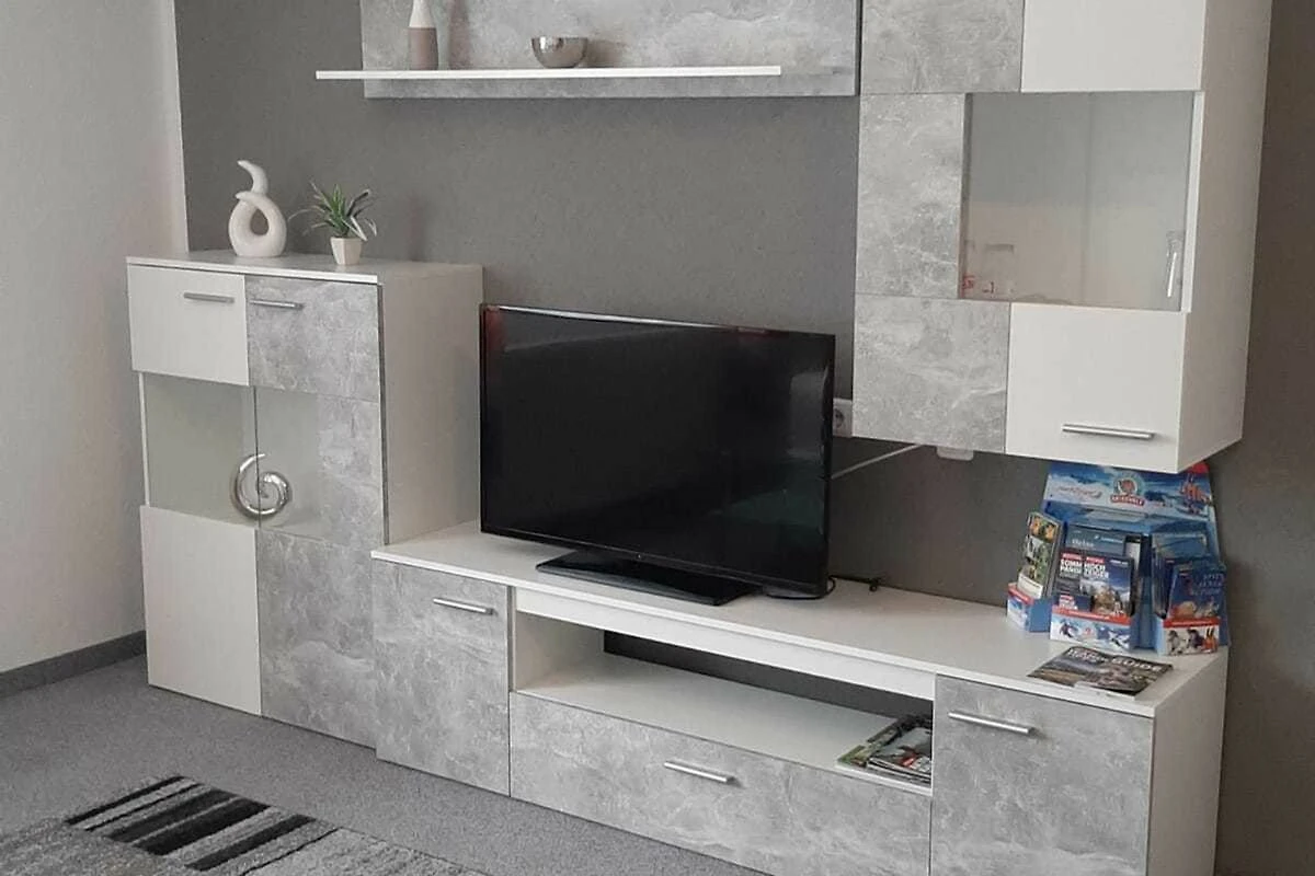 Sofa, Sat TV , Wohnwand mit Flachbildschirm.