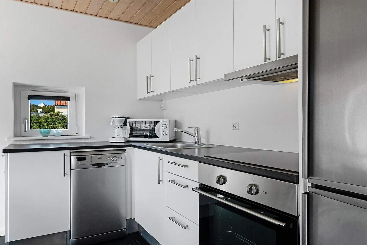 , Küche(Kochherd(2 Kochplatten), Kaffeemaschine, Backofen, Mikrowelle, Spülmaschine, Kühlschrank, Kühl-/Gefrierkombination), Wohn-/Schlafzimmer(Doppelklappbett , TV(dänische Fernsehsender)), Schlafzimmer(Doppelbett), Badezimmer(Waschbecken, Dusche, Toilette, Waschmaschine), Gartenmöbel, Liegestühle
