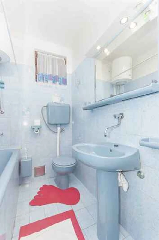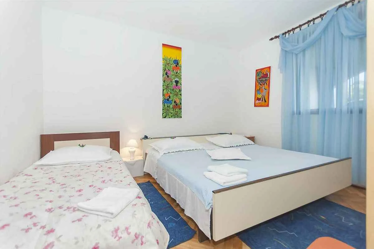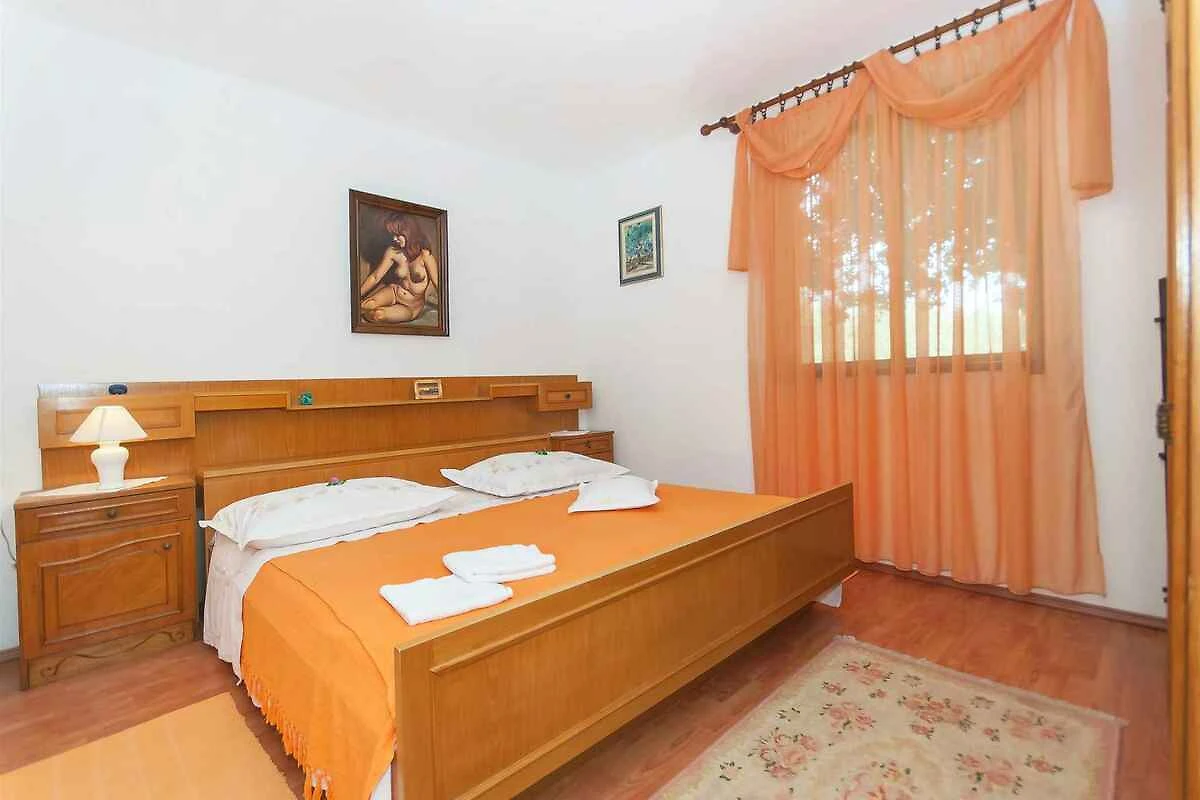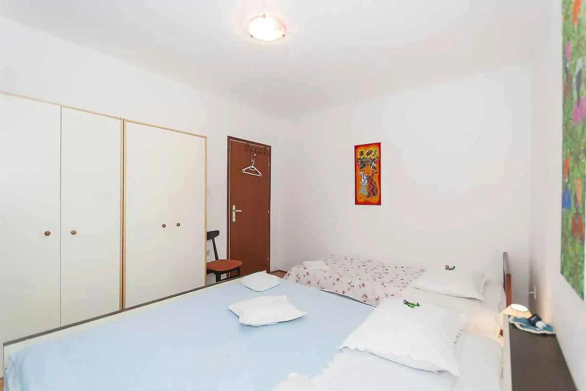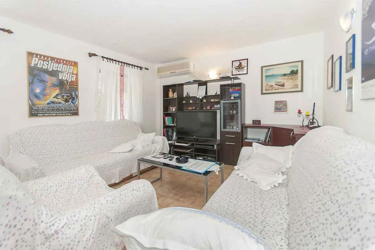 Rogoznica. Die Ferienwohnung befindet sich auf einem geschlossenen Gartengrundstück mit Blumen und Sträuchern, von einer Mauer begrenzt. Der Vermieter wohnt nur zeitweise im Haus, nutzt jedoch einen separaten Eingang. Aussicht: Grünfläche. Die Zufahrt erfolgt direkt von der Hauptstrasse (asphaltiert). Parkplatz auf dem Grundstück und der Strasse vor dem Haus.