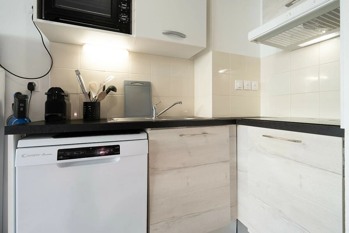 Die offene Elektroküche ist komplett ausgestattet mit Kühlschrank, Mikrowelle, Geschirrspüler, Kaffeemaschine, Toaster, Wasserkocher, Geschirr, Besteck und Küchenutensilien und sorgt so für ein stressfreies und angenehmes Erlebnis für alle Gäste.