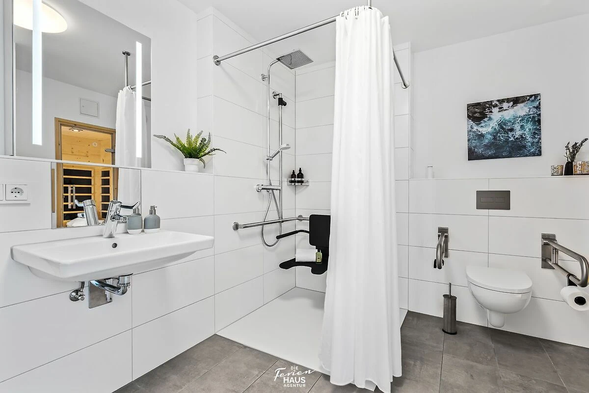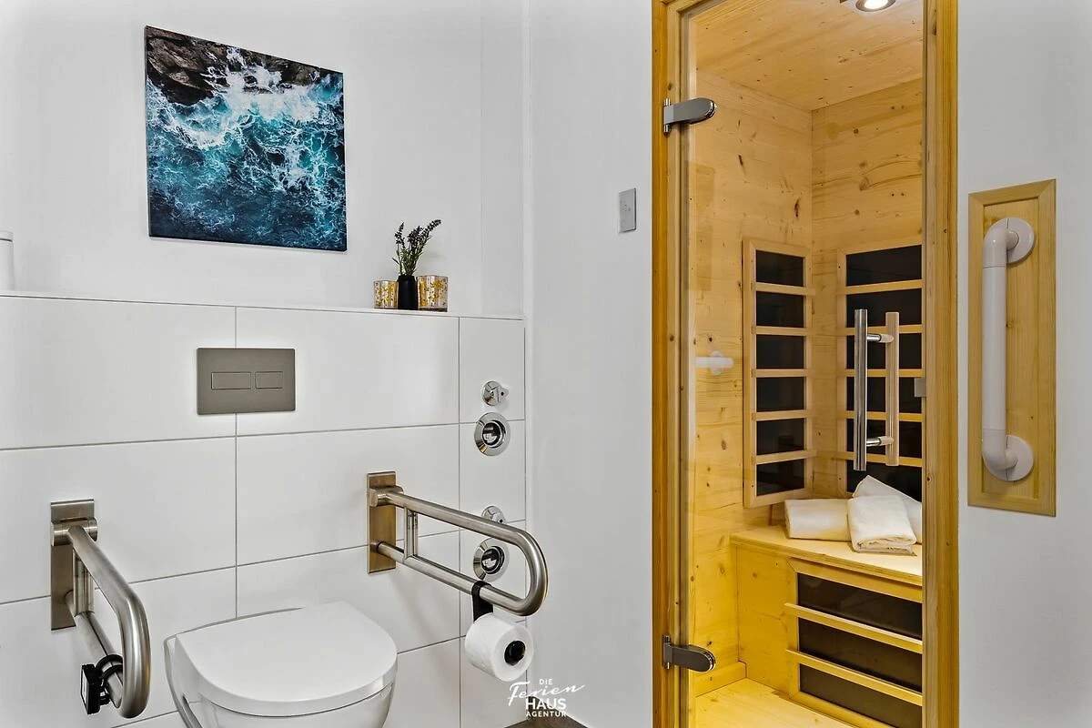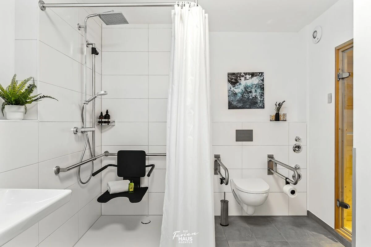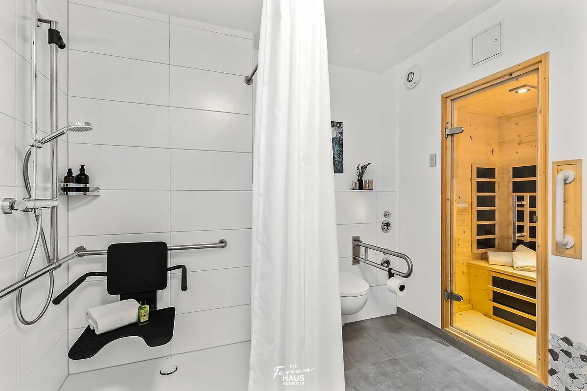 Das Duschbad bietet eine bodengleiche Dusche mit Reling über Eck, Duschstuhl und Extrastange zum Festhalten. Die Toilette ist höher gesetzt, von beiden seiten anfahrbar und mit hochklappbaren Stützgriffen versehen. Auch Waschbecken und Spiegelschrank sind dem/der Rolli-Fahrer/in angepasst. Die Infrarot-Kabine sorgt für eure ganz eigenen Wellnessmomente und hat Innen sowie Außen Haltegriffe.